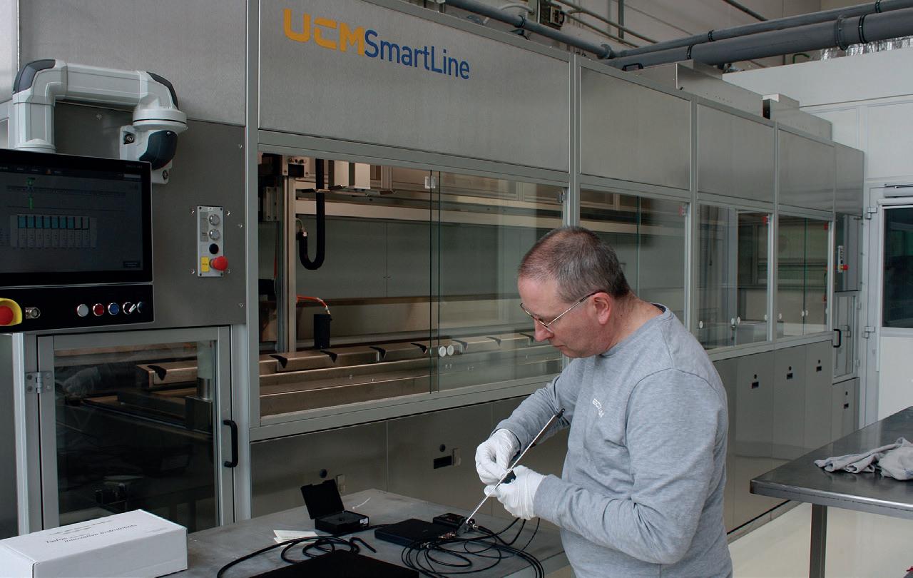 Olympus Surgical Technologies Europe, based in Hamburg and a leading manufacturer of medical endoscopy solutions, ensures compliance with standards during the final cleaning of coated precision optics by implementing a modular UCMSmartLine serial ultrasonic immersion system, combined with a customised service approach. This includes periodic inspection of the power and frequency of the ultrasound using Ecoclean's revolutionary Acoustic Performance Measurement (APM) system.