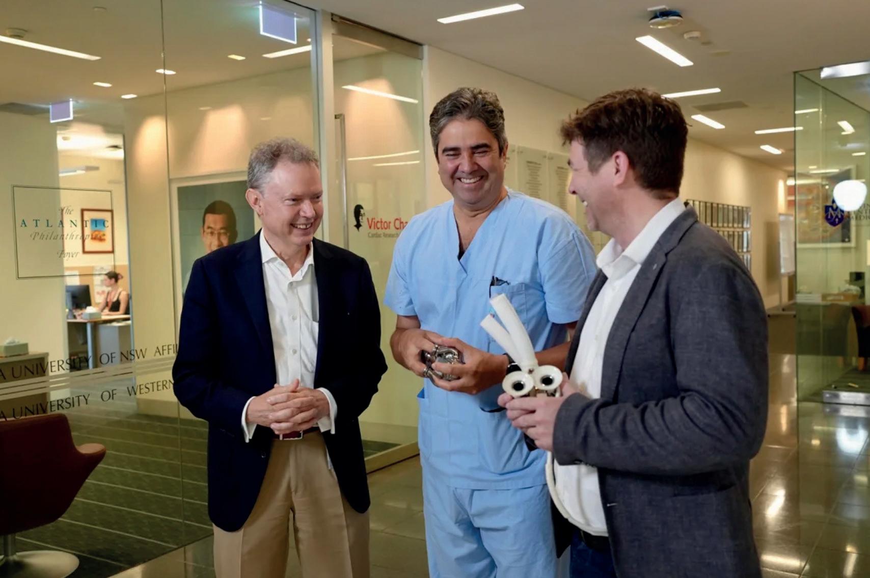 De gauche à droite, le professeur Chris Hayward et le docteur Paul Jansz qui ont collaboré avec leur confrère Daniel Timms pour la mise au point de ce cœur artificiel à des essais cliniques.