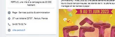 Avec ses rubriques thématiques et ses nombreux renseignements, ce livret vous sera non seulement indispensable pour mieux vivre Pertuis et profiter de ses activités, mais vous aidera aussi à consommer « local » et contribuer ainsi au dynamisme de nos commerces de proximité. Un grand merci à nos partenaires, qui grâce à leur soutien le font vivre. Merci également à tous les bénévoles qui donnent de leur temps au sein de nos associations pertuisiennes pour cultiver ce « vivre ensemble » qui nous est cher. Je vous invite enfin à consulter le site www.ville-pertuis.fr pour suivre l’actualité de notre commune et saisir en ligne nos services municipaux sans avoir à vous déplacer, ou encore vous abonner en un clic à notre newsletter dédiée aux événements marquants de la semaine. Vous pouvez également découvrir nos actions dans le magazine municipal « Pertuis Mag ». Enfin, une page Facebook Ville de Pertuis ainsi qu’un compte Instagram vous permettent de réagir en temps réel sur les moments forts de la vie municipale.