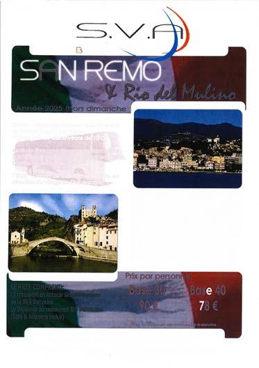 Le CCAS souhaite organiser, pour les personnes à partir de 65 ans, 2 sorties en bus courant mai/juin 2025. L’une à Bordighera prévue un jeudi et l’autre à San Remo prévue un samedi (voir détails et descriptifs sur affiche). Afin de pouvoir organiser au mieux ces sorties et pour plus de détails, vous pouvez vous préinscrire auprès du CCAS soit par mail à c.clary@ville-fayence.fr soit par téléphone au 04 94 39 15 31. Christine CANALES