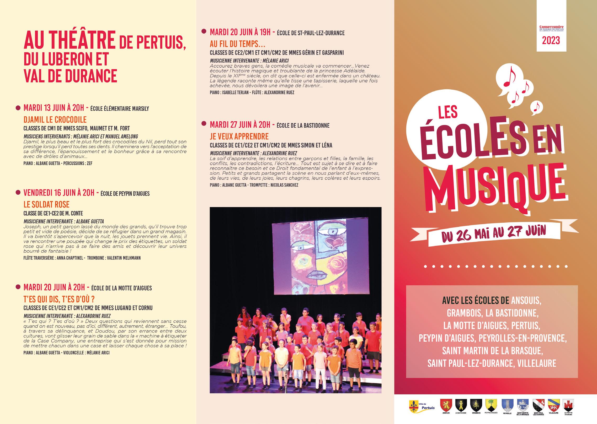 Parce qu’une saison culturelle se construit avec les établissements scolaires, les associations, nos partenaires institutionnels, les rendez-vous présentés dans ce programme sont le fruit de nos échanges réguliers . Sans oublier le conservatoire qui tout au long de l’année accompagne la vie musicale à Pertuis avec des auditions régulières, des concerts, ... chorales et orchestres.