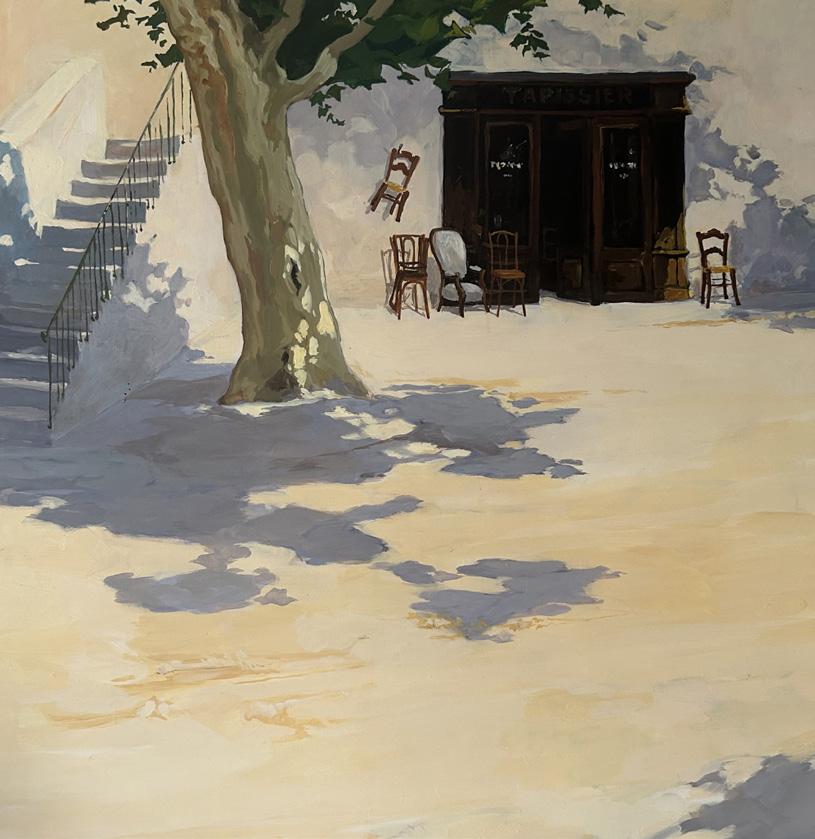 Toute en subtiles nuances d'ocres et de gris, sa palette met en lumière les lieux qu'il affectionne, les places ombragées, les cafés, les paysages méditerranéens... dont il fait revivre l'ambiance, à sa manière.