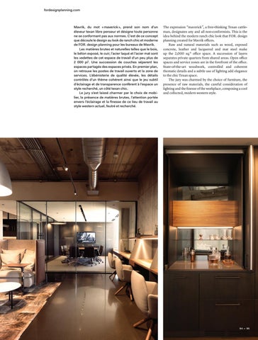 The expression “maverick”, a free-thinking Texan cattleman, designates any and all non-conformists. This is the idea behind the modern ranch chic look that FOR. design planning created for Mavrik offices. Raw and natural materials such as wood, exposed concrete, leather and lacquered and mat steel make up the 2,000 sq.ft office space. A succession of layers separates private quarters from shared areas. Open office spaces and service zones are in the forefront of the office. State-of-the-art woodwork, controlled and coherent thematic details and a subtle use of lighting add elegance to the chic Texan space. The jury was charmed by the choice of furniture, the presence of raw materials, the careful consideration of lighting and the finesse of the workplace, composing a cool and collected, modern western style.
