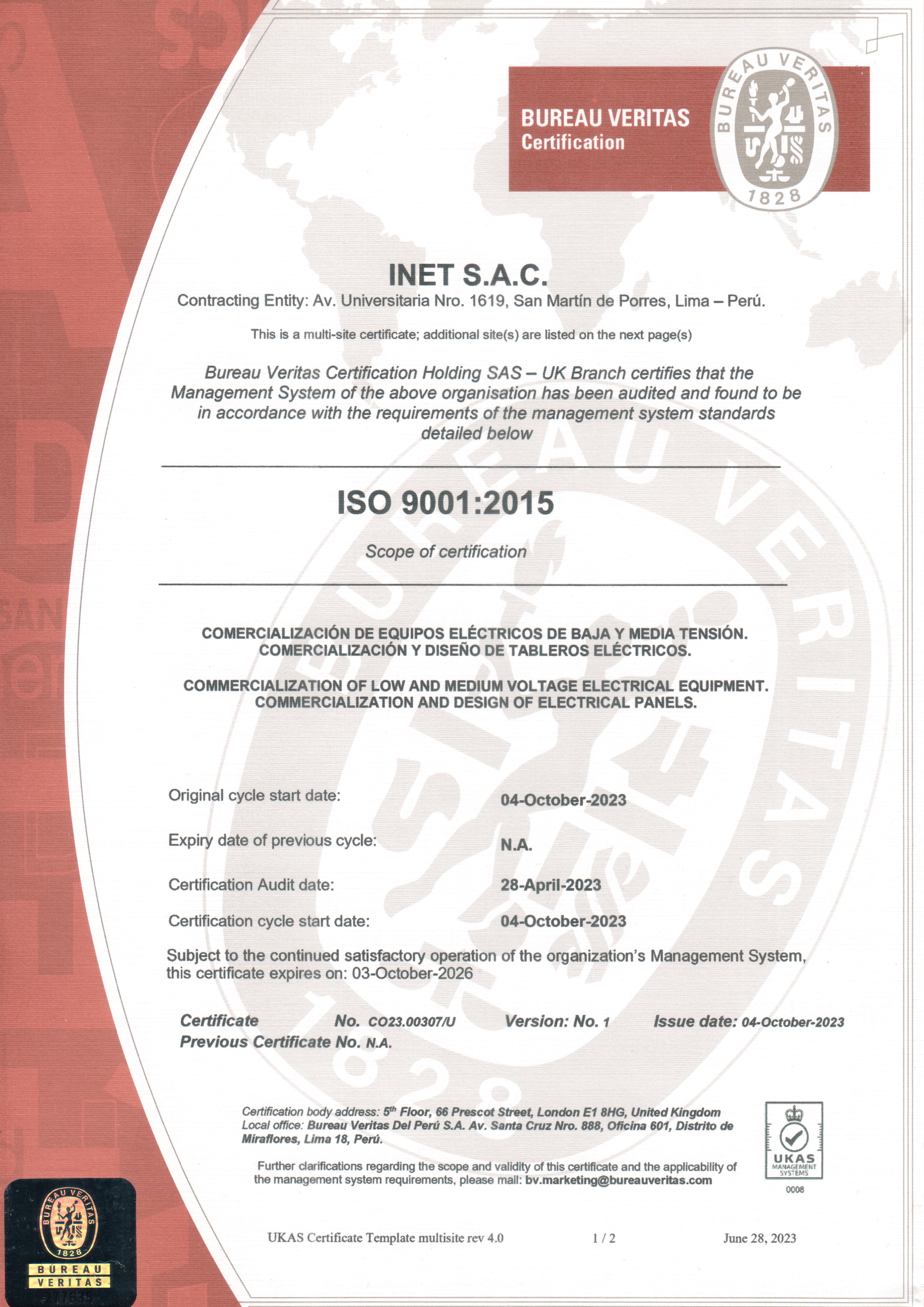 INET SAC se enorgullece en informar que ha sido certificado bajo la norma ISO 9001:2015 por Bureau Veritas Certification, tanto en la comercialización de equipos de baja y media tensión como en la venta de tableros eléctricos. Esto asegura que nuestros procesos cumplen con los más altos estándares de calidad a nivel internacional.