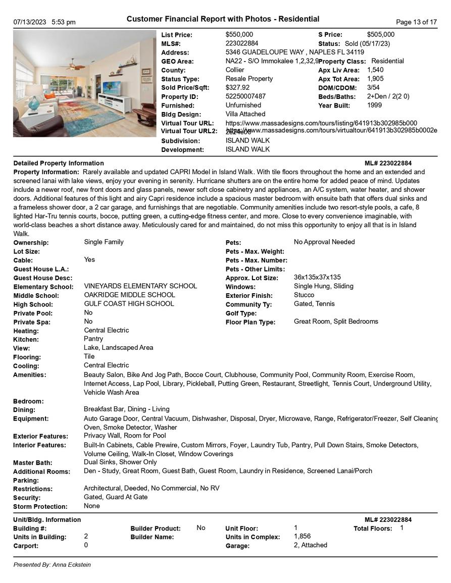 "WehaveknownAnnaEcksteinforover4yearsaftershehelped uspurchaseanotherpropertyandfromthatexperiencewefeel thathandsdownsheisthebestagentinNaples.