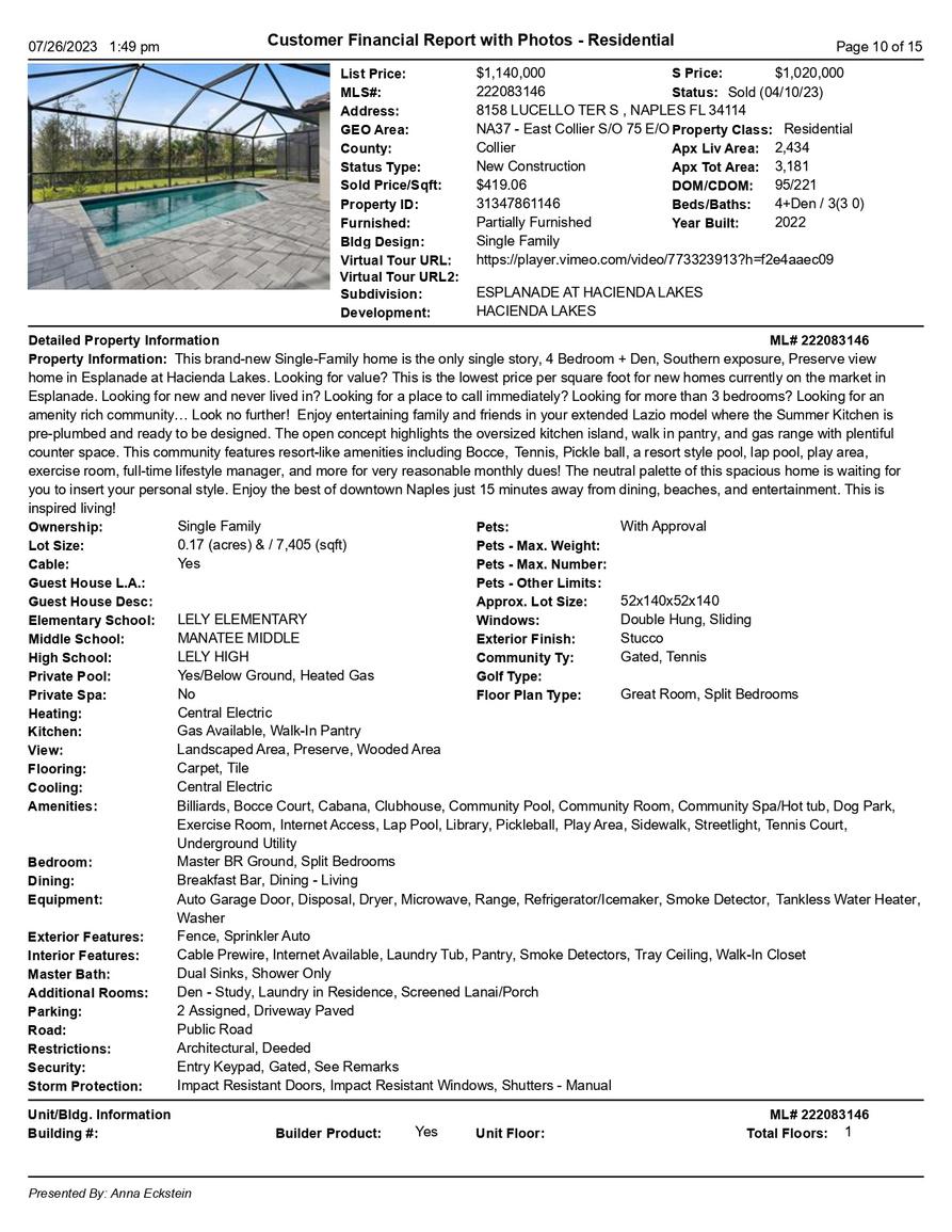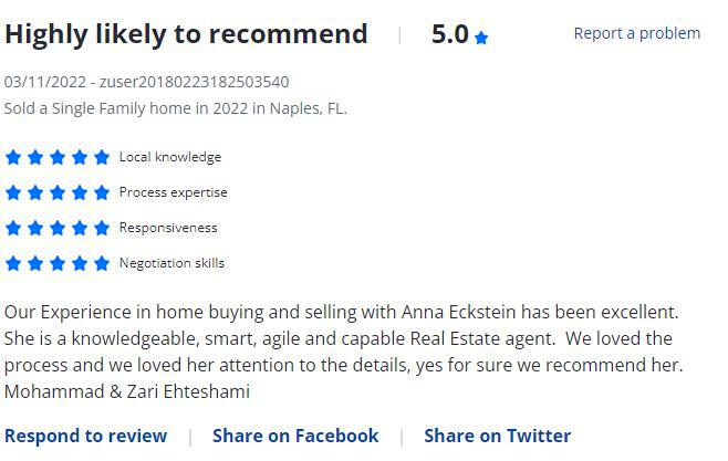 "We have known Anna Eckstein for over 4 years after she helped us purchase another property and from that experience we feel that hands down she is the best agent in Naples. Her likeability, professionalism and negotiations skills distinguishes her on a level reserved for elite luxury agents.