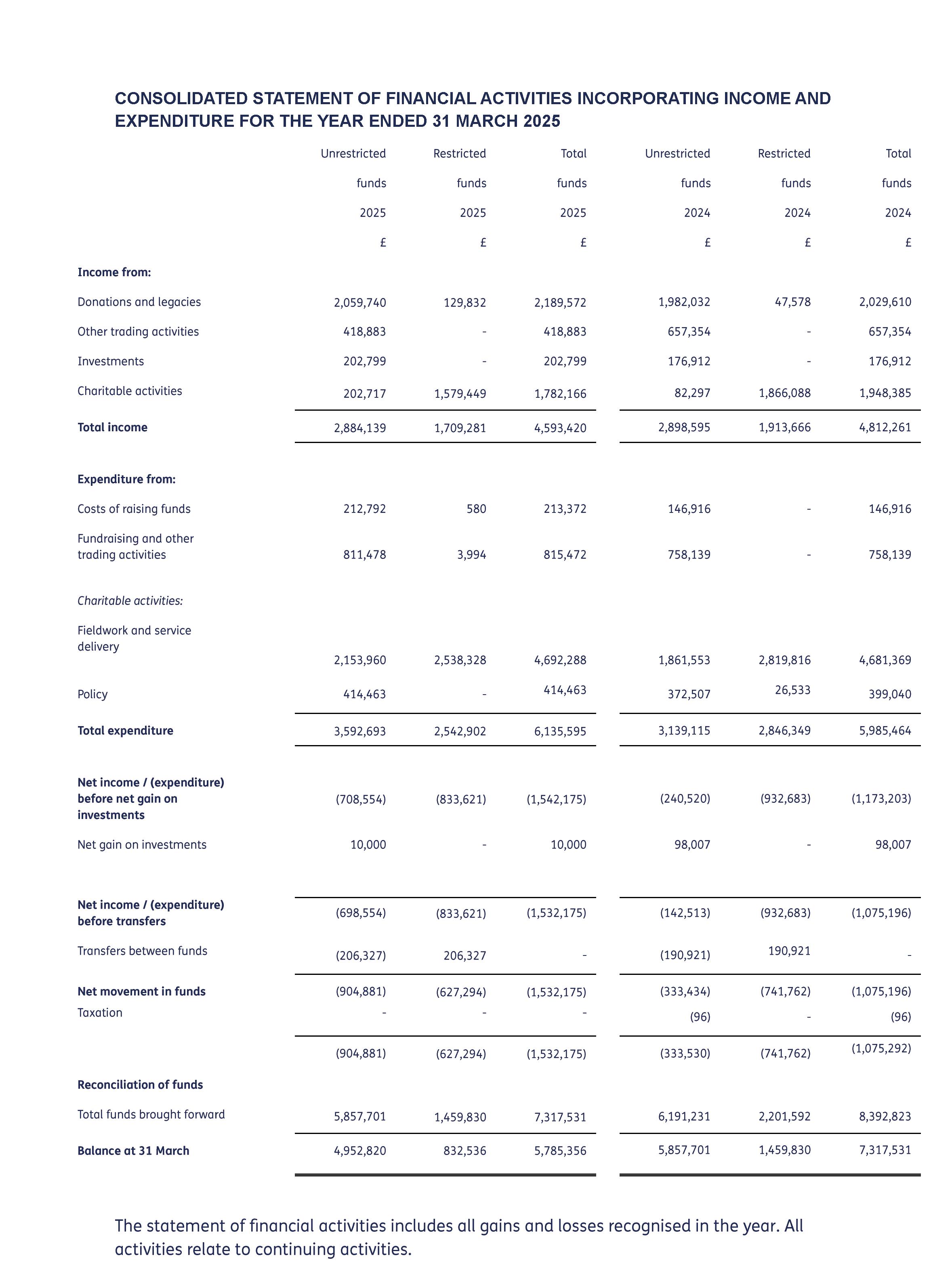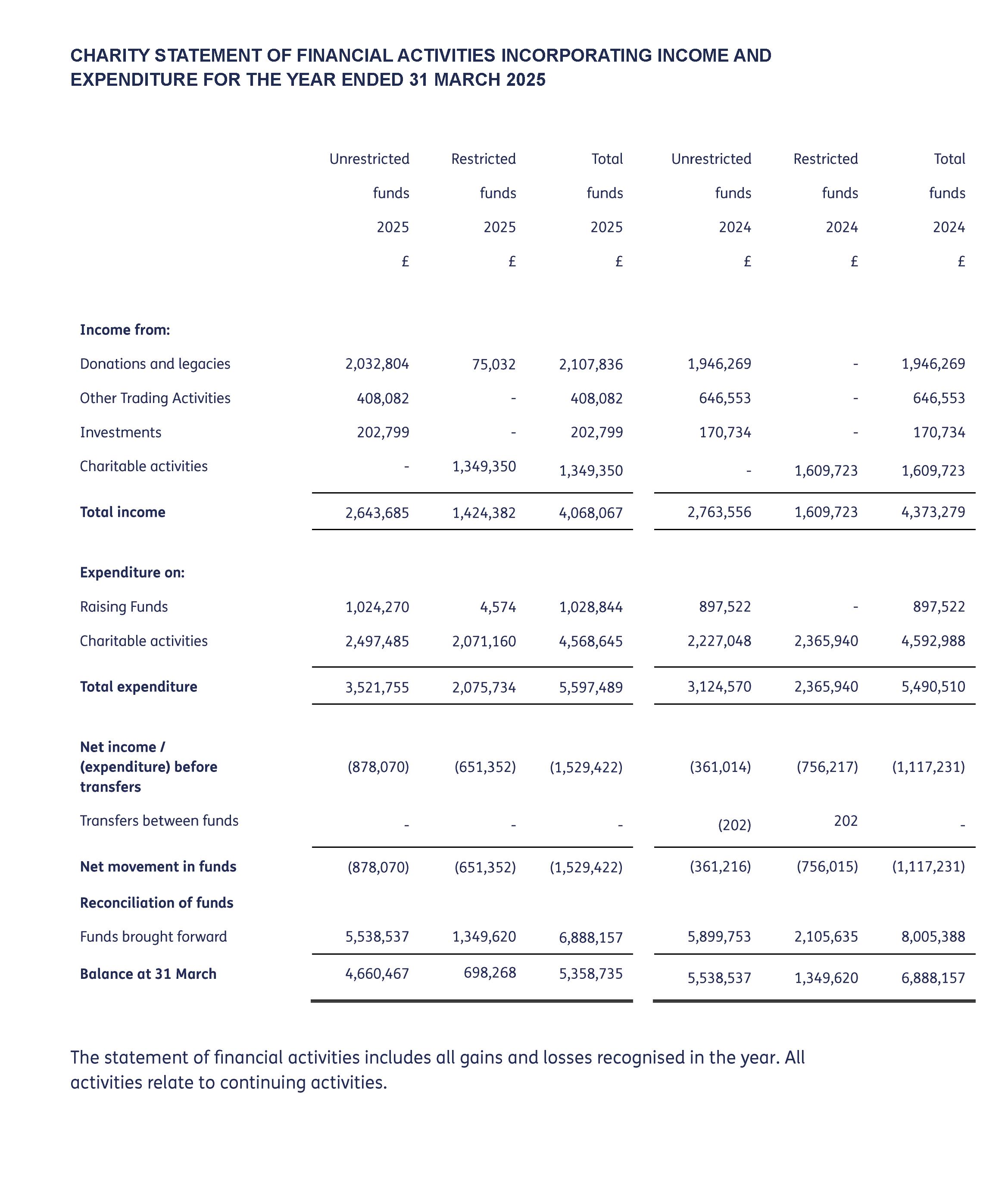 There was a deficit after taxation of £904,881 on unrestricted activities (2024: £333,530 deficit). This deficit on unrestricted funds was primarily driven by a planned for draw down of funds to allow for a growth in income generation capacity and increased service provision.