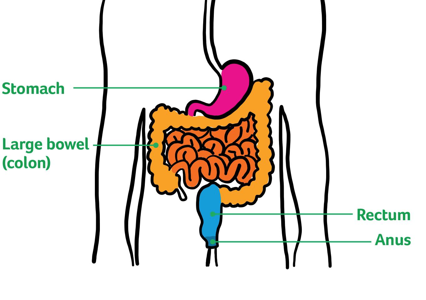 When the food we’ve eaten has been digested by the stomach it passes into the small bowel, or ileum. This is where most of the nutrients are absorbed into the body. What is left then moves through the large bowel, or colon. Water and more nutrients are absorbed, making the remains of the food more solid but ideally still slightly soft.