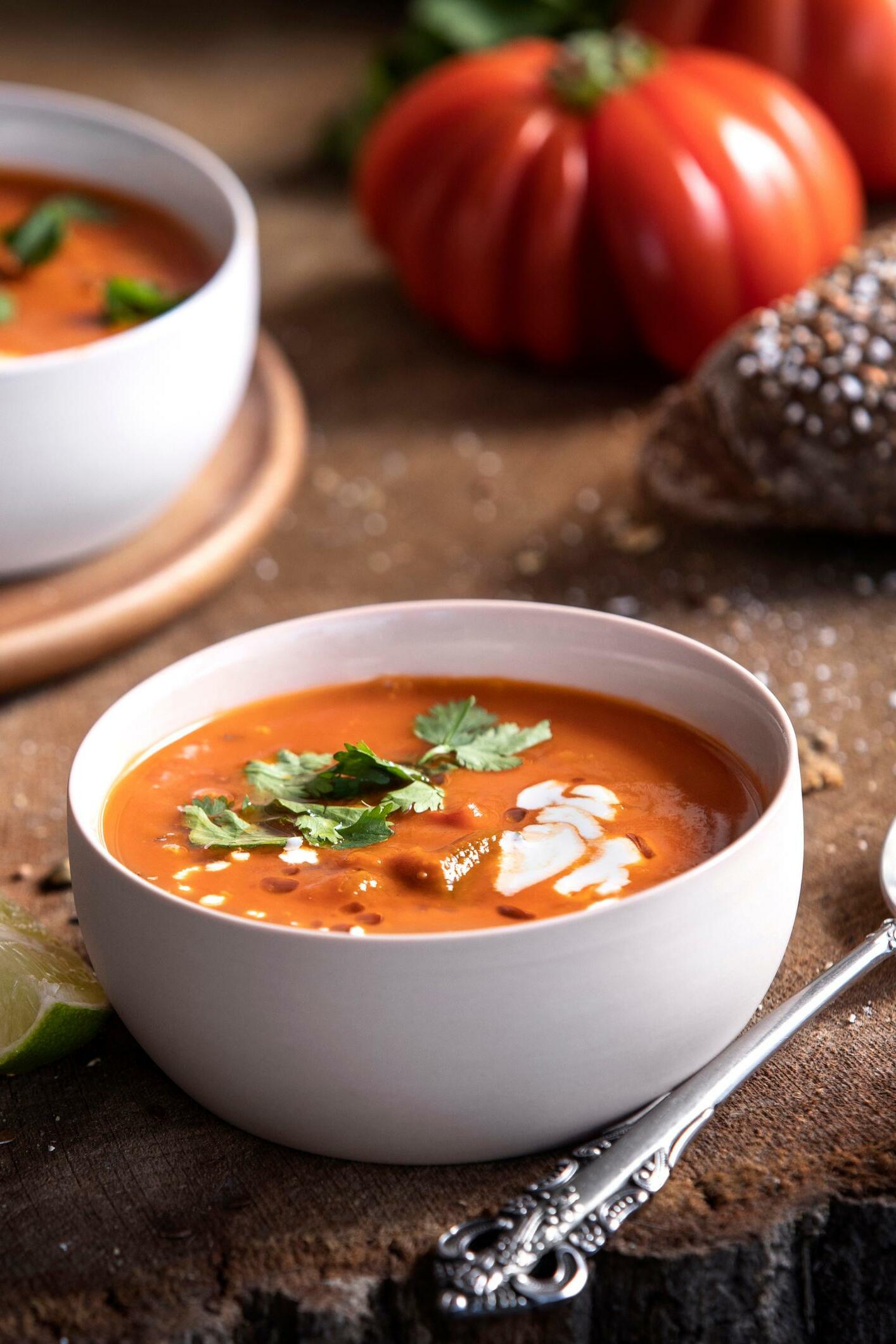 Roer net voor het serveren de rode pesto door de soep en garneer met blaadjes basilicum en eventueel nog wat extra pesto.