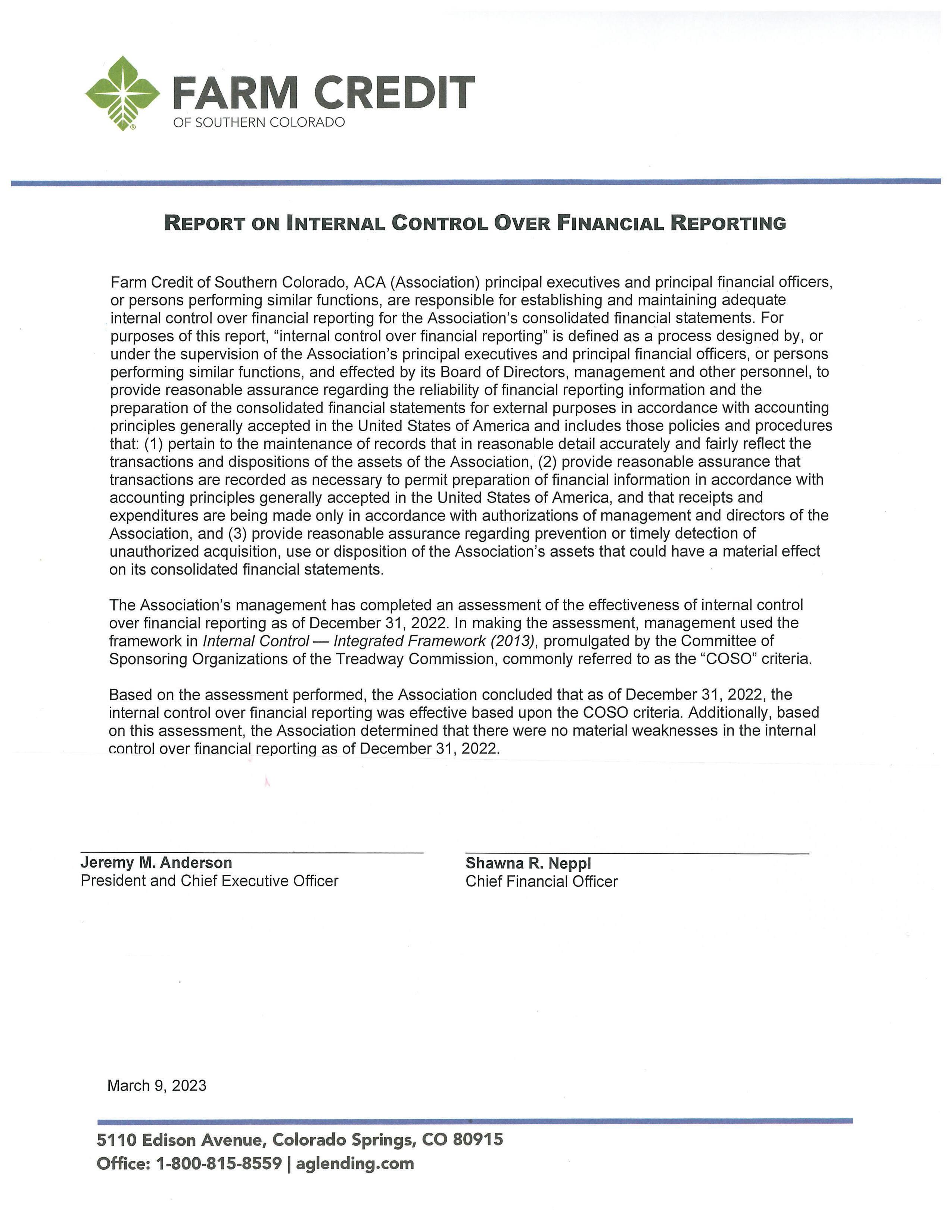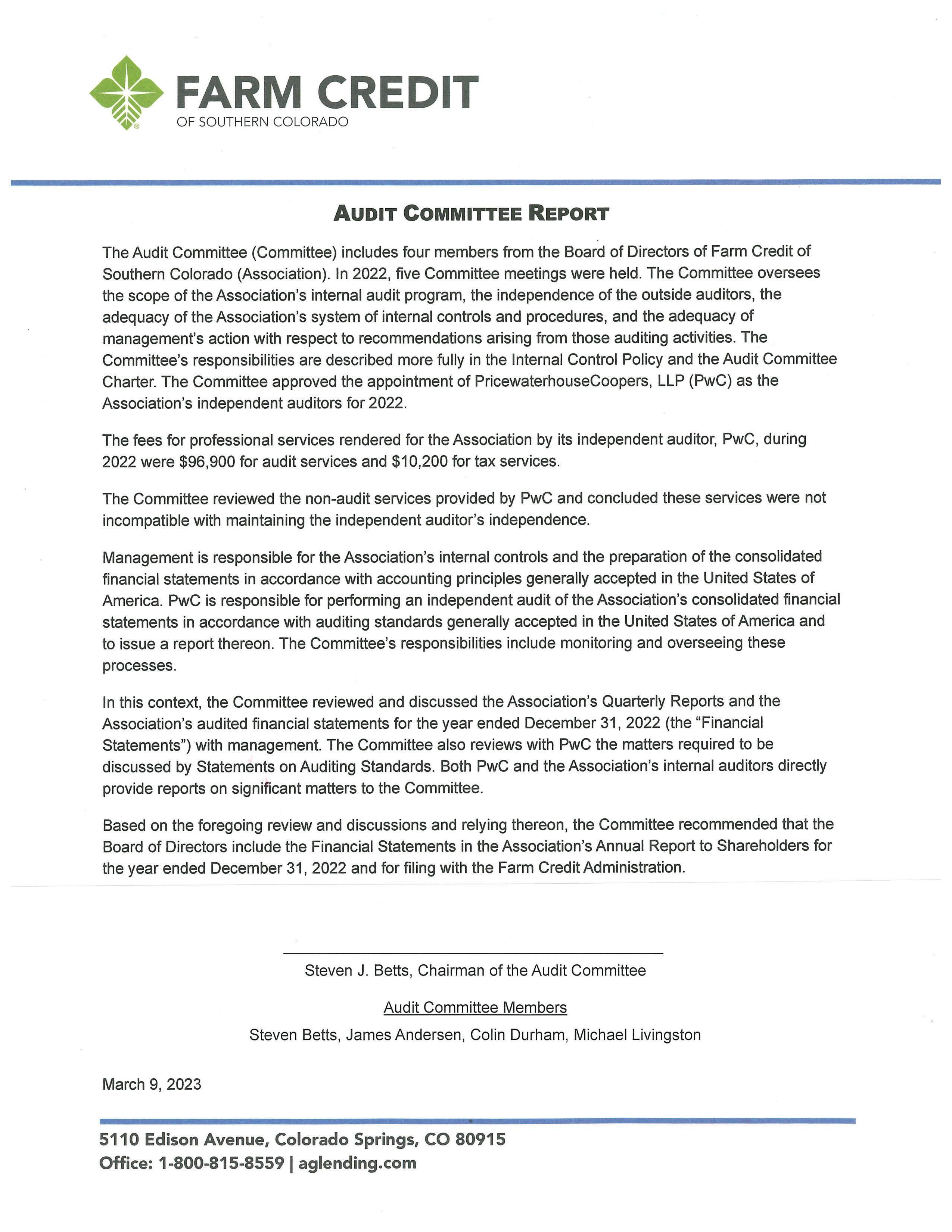At Farm Credit of Southern Colorado, we understand that our customers expect competitively priced products and services, exceptional customer service, convenient credit delivery, knowledgeable staff, and a dedicated management team. It is a pleasure to serve, you, our member owners. We are proud to present our 2022 Farm Credit of Southern Colorado Annual Report of Financial Condition.