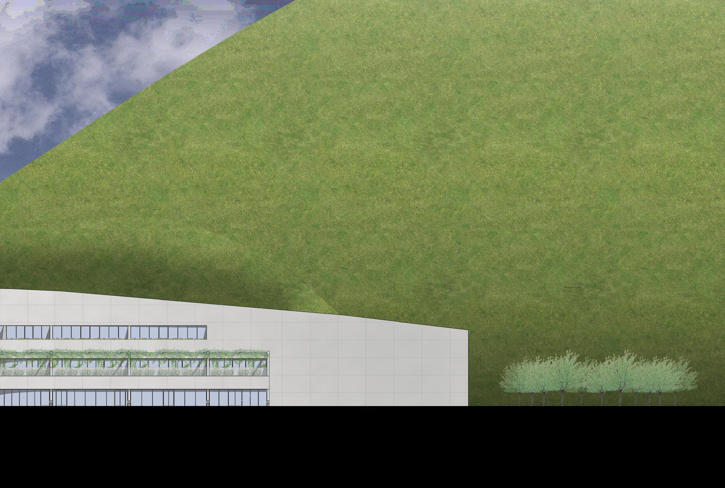 Per tale ragione si è scelto un’ambientazione caratterizzata dalla forte presenza di un rilievo collinare, che si sviluppa ai confini dell’area di progetto. L’edificio si configura come una curva della collina che dilatandosi si affianca ad essa. L’involucro assume il significato di una pelle protettiva, tagliata da grandi aperture longitudinali che garantiscono l’ingresso di luce naturale in abbondanza e molte occasioni di vista dell’esterno, che mantengono saldo il legame con esso. A rafforzare questo legame ed a disposizione della pratica di ortoterapia, sono stati pensati numerosi inserti vegetali come piccoli giardini d’inverno, terrazze con pergolati fioriti e una serra.