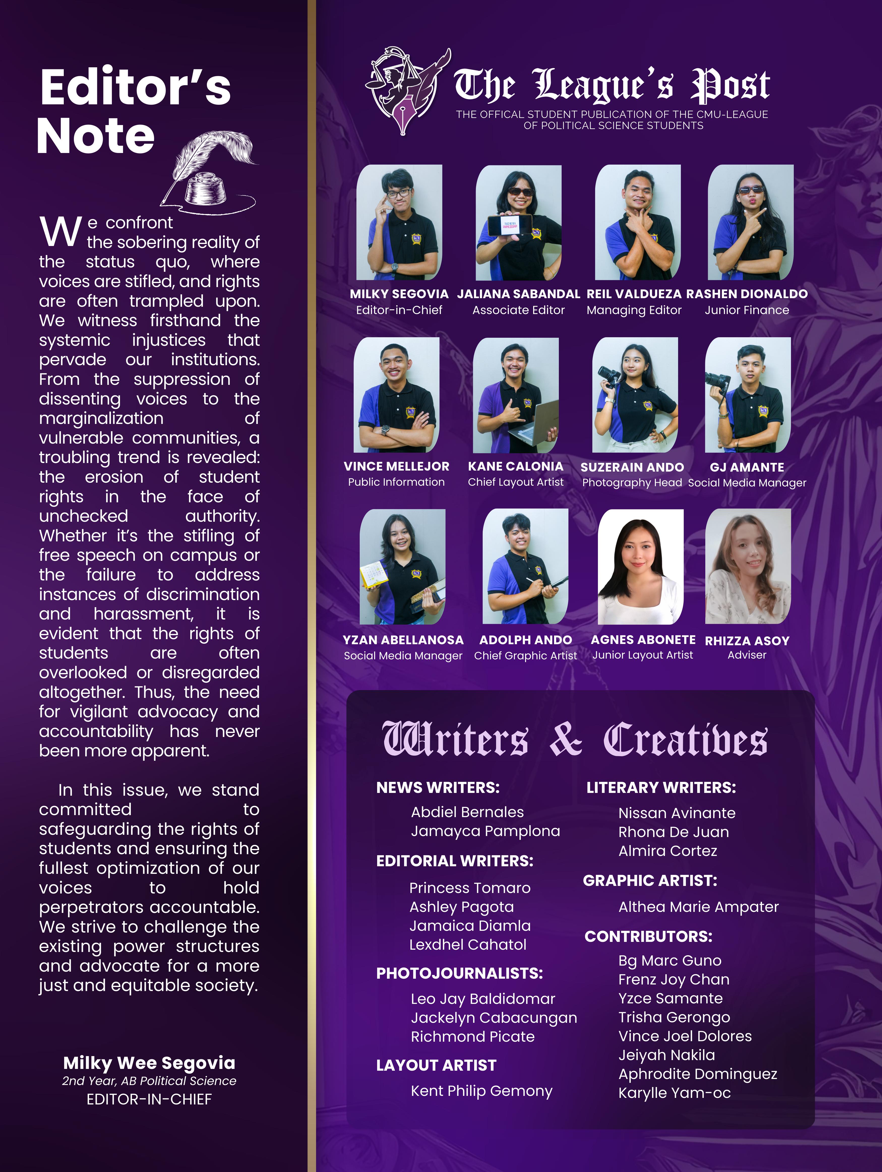 The League’s Post commended its annual screening process, which has identified a promising cohort of writers and artists slated to become the new standard-bearers of factual news, delivering pertinent articles and championing genuine campus journalism.SONA 2023: