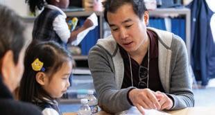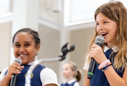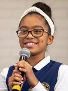 PreK student Kori Johnson ’37 takes the mic, guided by second grade teacher Noelle Harmon ’04