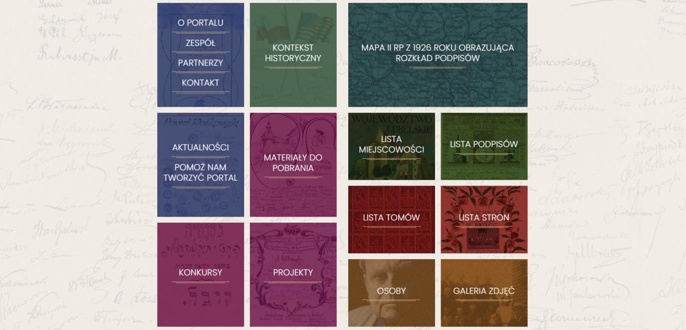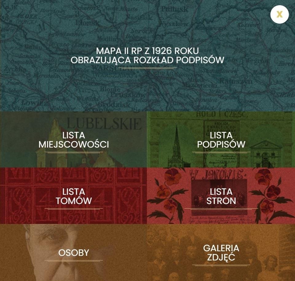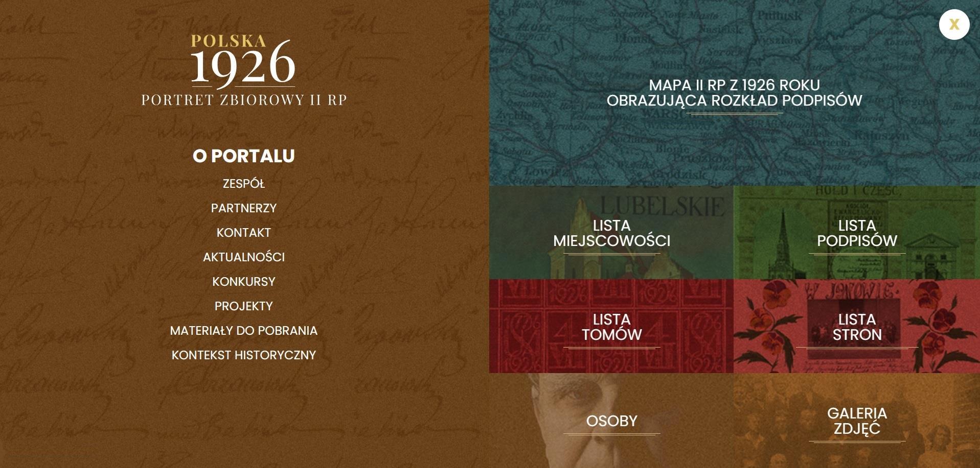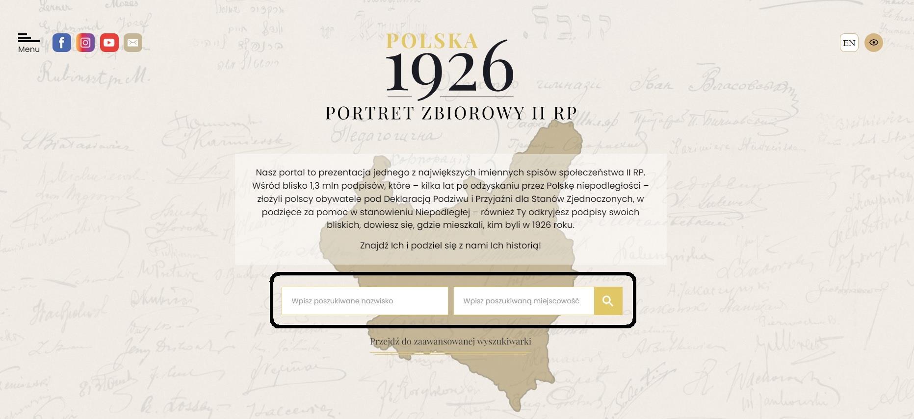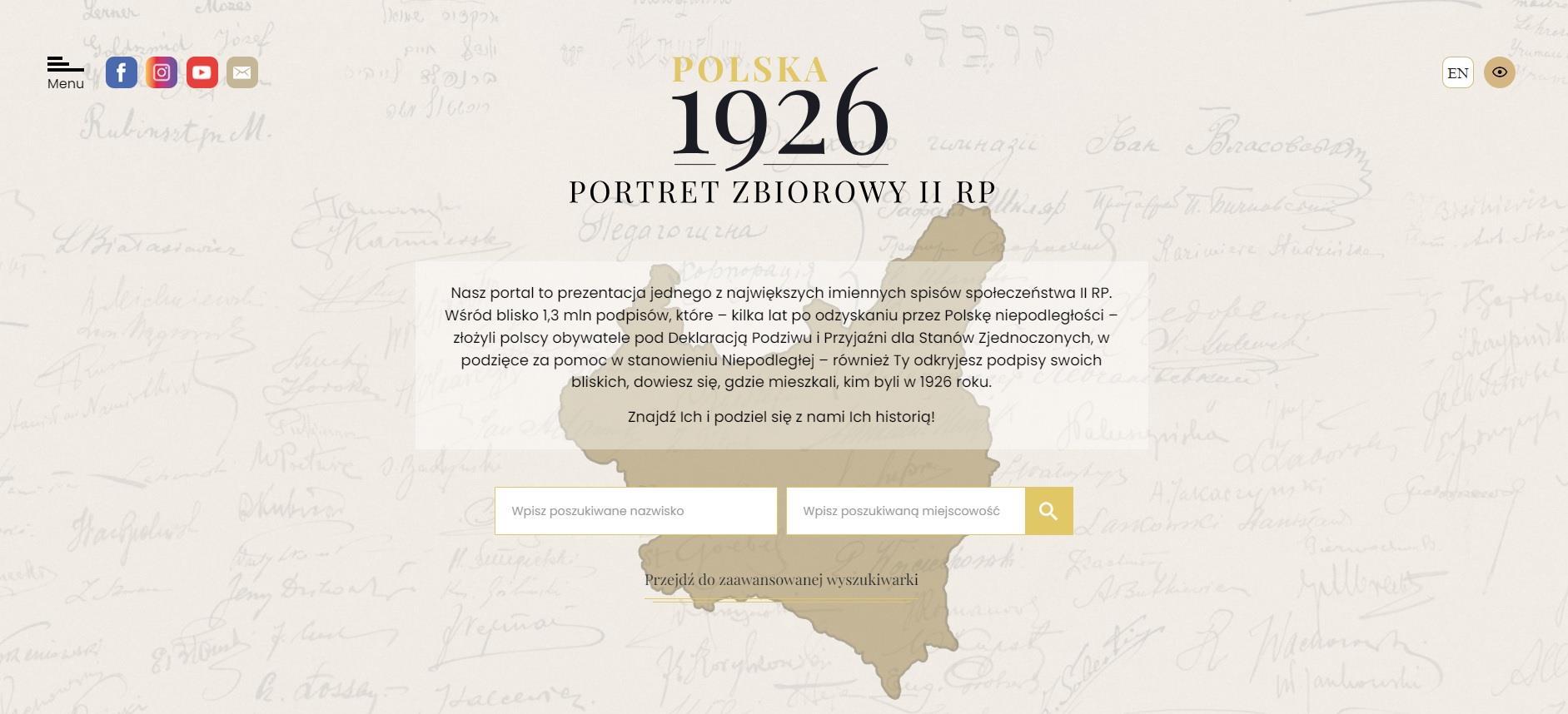 Portal Polska1926.pl to prezentacja jednego z największych imiennych spisów społeczeństwa II RP. Wśród blisko 1,3 mln podpisów, które – kilka lat po odzyskaniu przez Polskę niepodległości – złożyli polscy obywatele pod Deklaracją Podziwu i Przyjaźni dla Stanów Zjednoczonych, w podzięce za pomoc w stanowieniu Niepodległej. Użytkownicy portalu mogą tutaj odkryć podpisy swoich bliskich, dowiedzieć się, gdzie mieszkali, a nawet kim byli w 1926 roku. Mogą również dodać te informacje na portal poprzez kontakt z twórcami portalu lub uczestnicząc w konkursie ogłaszanym na portalu. Więcej na ten temat w sekcjach “Kontakt z twórcami” oraz “Konkursy”.