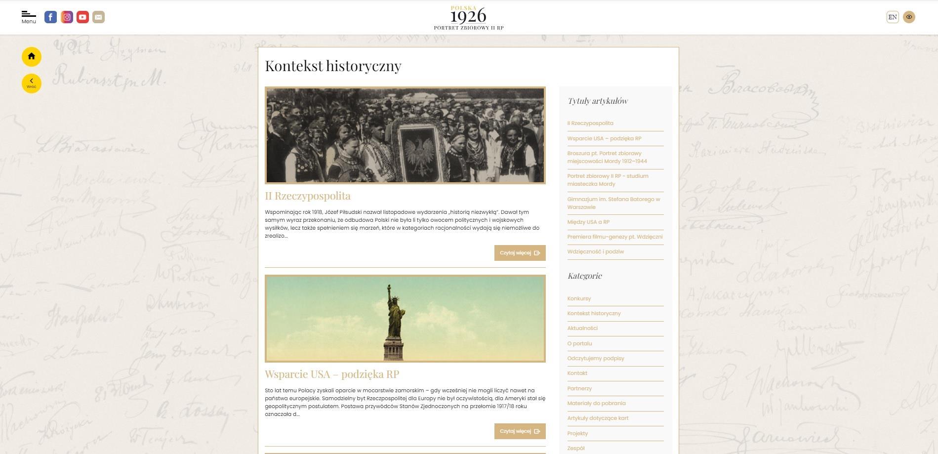 - kontekst historyczny: po wejściu w ten kafelek możemy zapoznać się z artykułami na ten temat