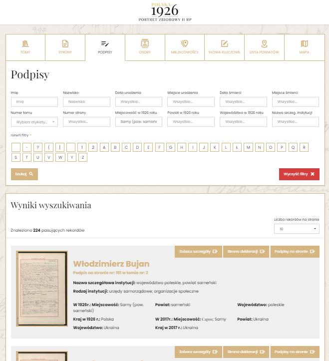 Wyniki tego wyszukiwania przenoszą użytkownika do podstrony “Podpisy” ale przefiltrowanej do wyników dotyczących danej miejscowości.