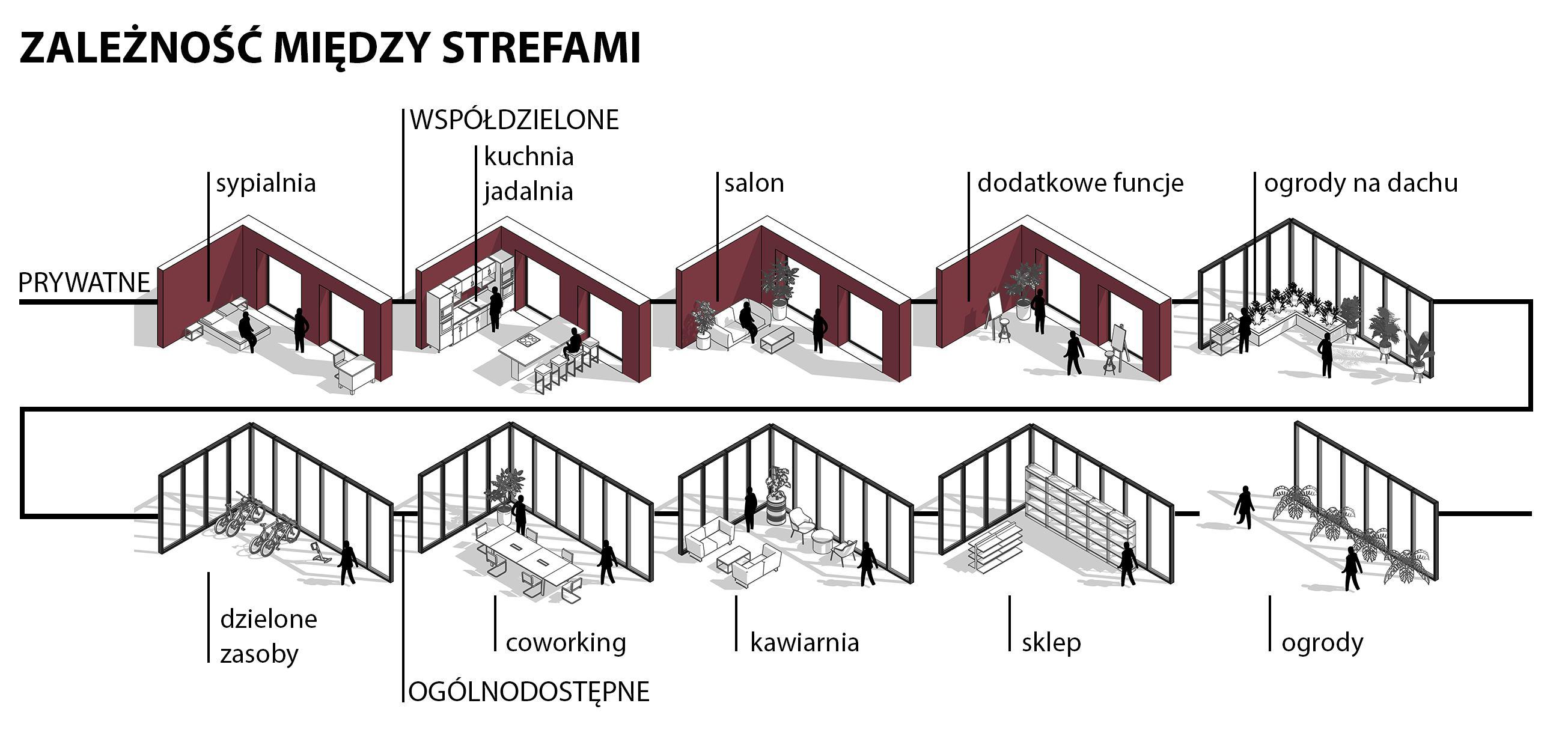 Projekt przewiduje też ogólnodostępne przestrzenie, jak kawiarnie i sklepy, które mogą być prowadzone przez mieszkańców sprzedających produkty z ogrodów miejskich.