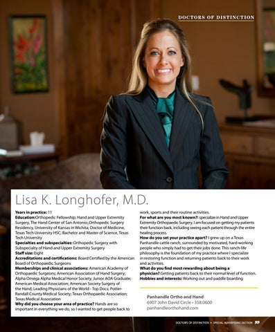 Lisa K. Longhofer, M.D. Years in practice: 11 Education:Orthopedic Fellowship, Hand and Upper Extremity Surgery, The Hand Center of San Antonio;,Orthopedic Surgery Residency, University of Kansas in Wichita; Doctor of Medicine, Texas Tech University HSC; Bachelor and Master of Science, Texas Tech University Specialties and subspecialties: Orthopedic Surgery with Subspecialty of Hand and Upper Extremity Surgery Staff size: Eight Accreditations and certifications: Board Certified by the American Board of Orthopaedic Surgeons Memberships and clinical associations: American Academy of Orthopaedic Surgeons; American Association of Hand Surgery; Alpha Omega Alpha Medical Honor Society, Junior AOA Graduate; American Medical Association; American Society Surgery of the Hand; Leading Physicians of the World - Top Docs; PotterRandall County Medical Society; Texas Orthopaedic Association; Texas Medical Association Why did you choose your area of practice? Hands are so important in everything we do, so I wanted to get people back to