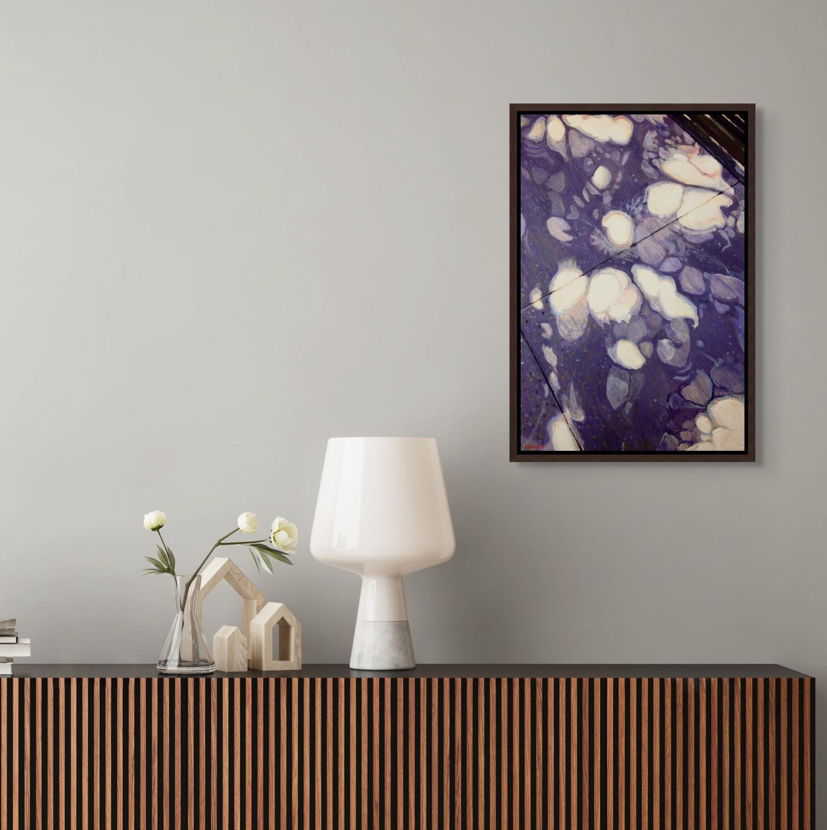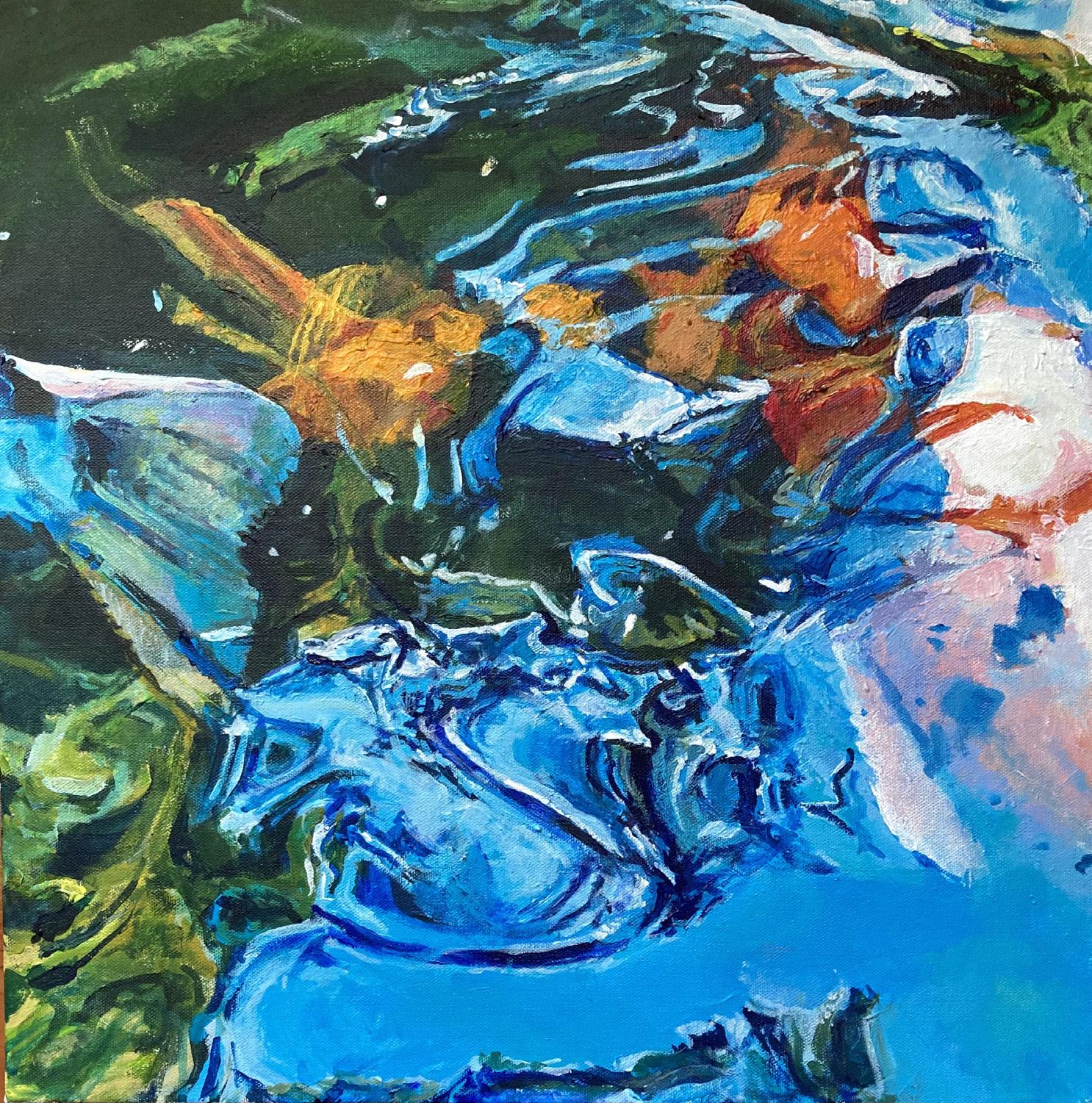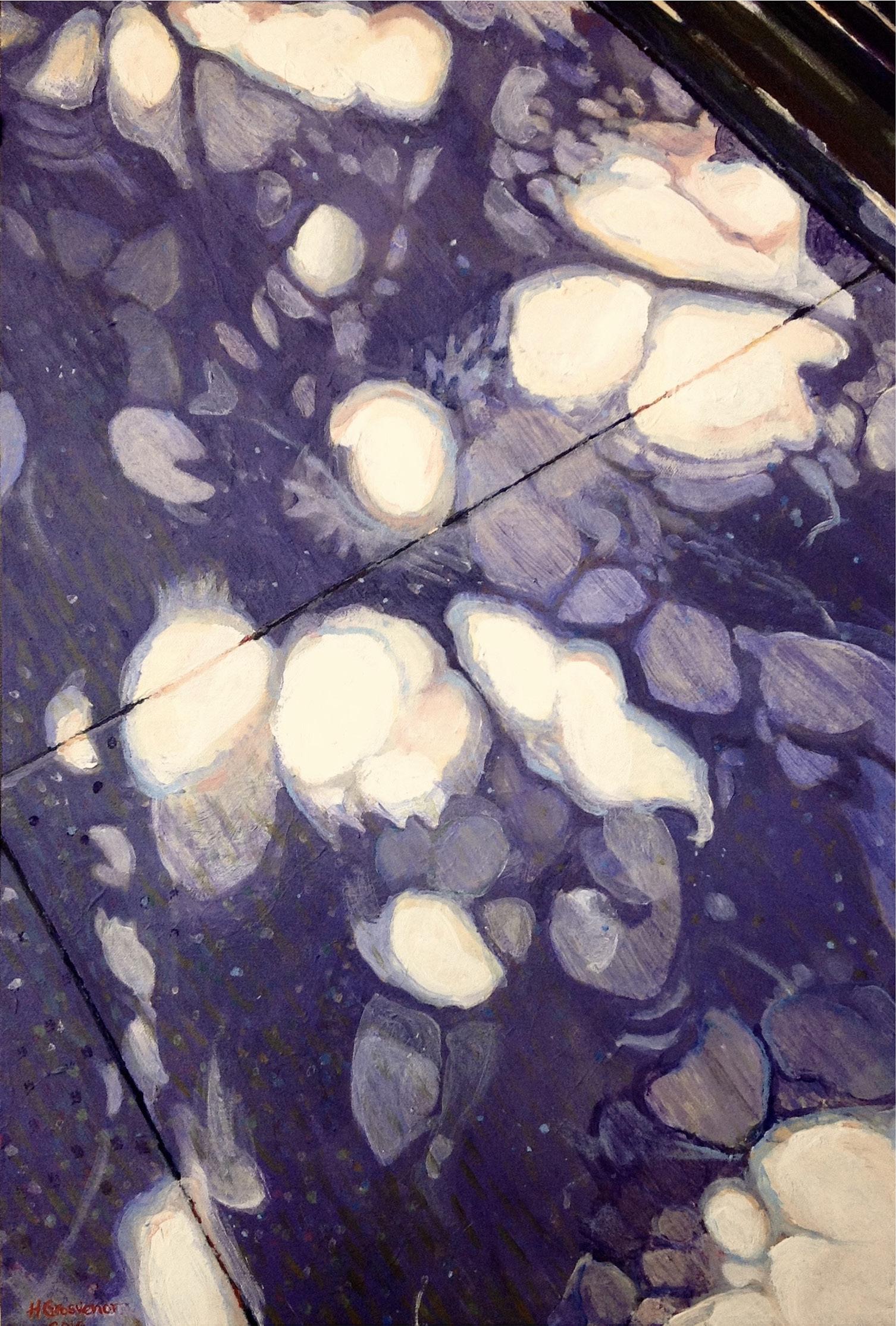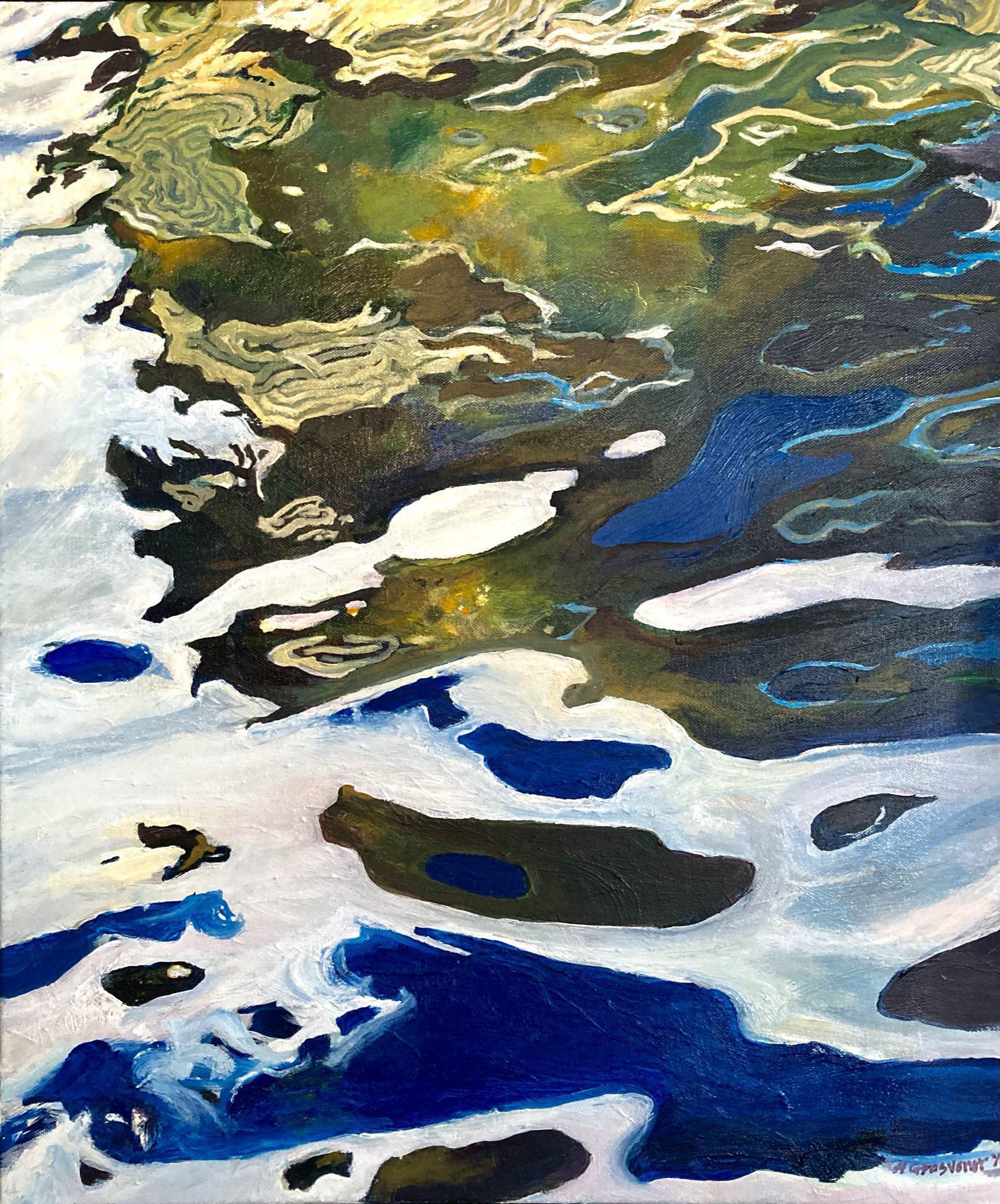 Inspired by the hues and movement of light, artist Holly Grosvenor studies and captures the luminosity of her natural environments. Grosvenor creates her work both on-site and in the studio, as she selects and magnifies fragments of natural settings to translate in oil and acrylics on her canvases. Her work is a response to her personal experiences in the natural realm, as she creates multiple plein air observation sketches in watercolor on site, as well as detailed photographs of the space, and returns to her studio to recreate these environments in oils and more recently, acrylics. Acrylics as a medium allowed Grosvenor to delve more deeply into the behavior of reflection and translucency on water and reflective surfaces, as it granted her more time to develop each painting and emphasize the details of the natural phenomena.