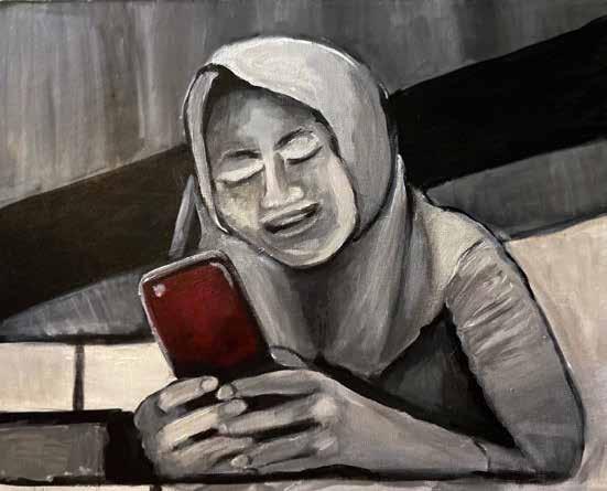 Stelnik’s work features a blend of color and texture, primarily using acrylics for their quickdrying and layering properties. While her subjects evolve, her style of broad strokes, vibrant colors, and rich textures remains constant. Her latest series Phonemotions explores people’s uninhibited behavior while using their phones and the emotions they display.“I’ve always imagined that if aliens came down to earth and saw people on their phones, they might think that their devices are real beings.”