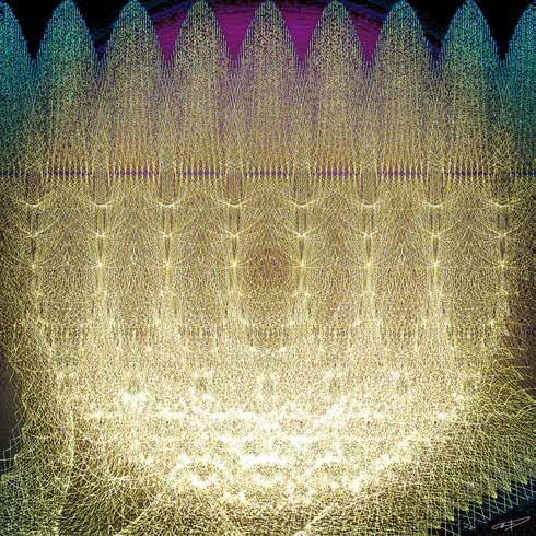 Acrylic and fluorescent paints, fabrics, sequins, rhinestones, glitter, mirrors & holographic vinyl on canvas 36” x 48”