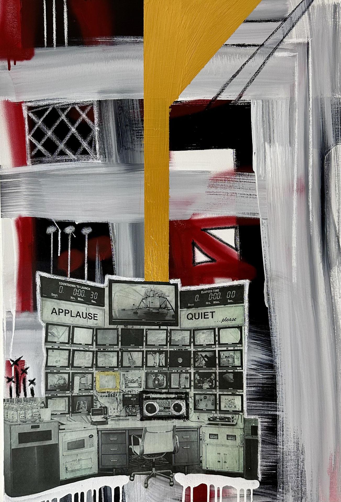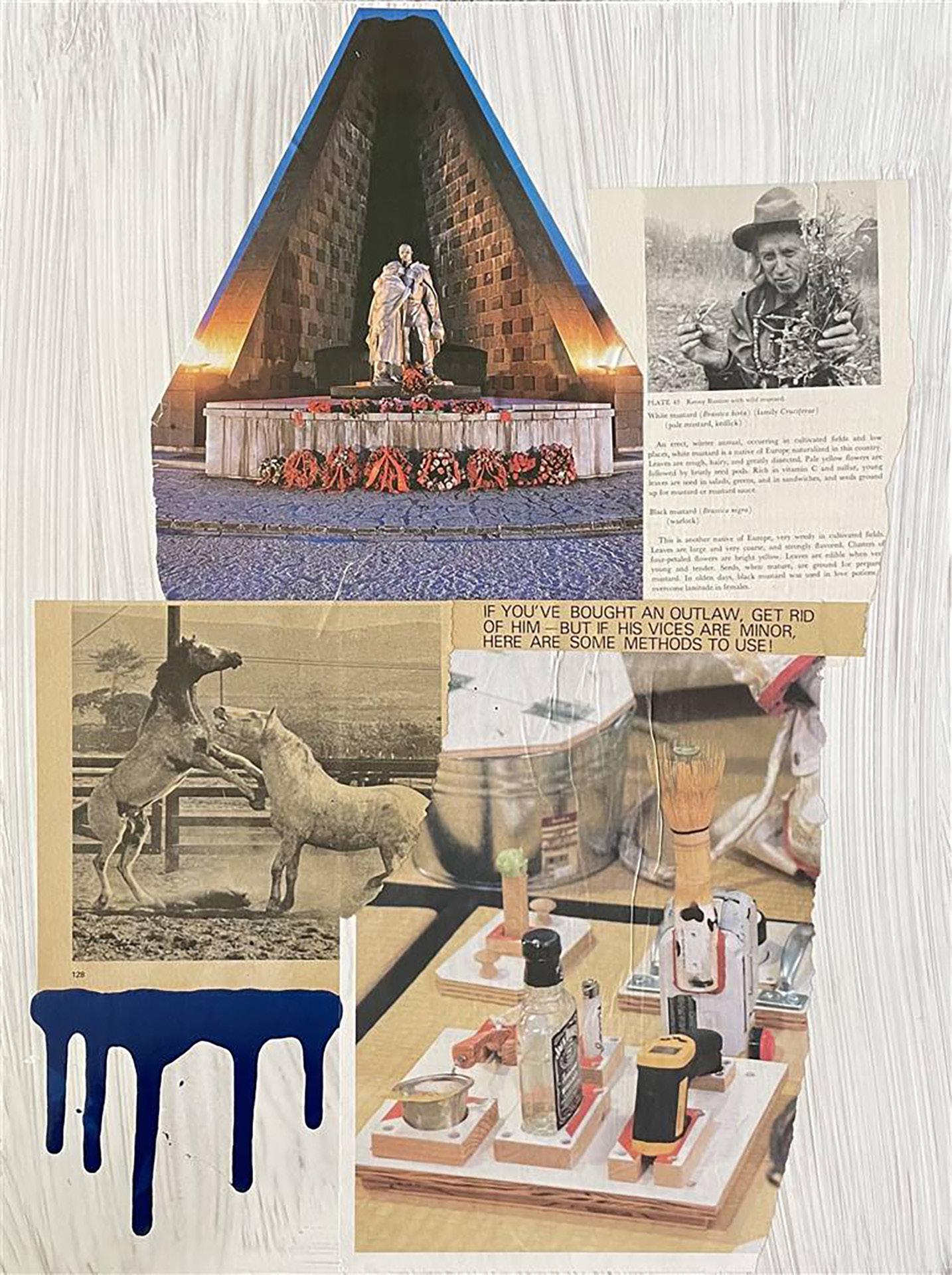 Atkinson’s multi-media works combine imagery from his day-to-day life with imagery from pop culture and street art, which are assembled into collaged pieces. Atkinson applies dynamic brush strokes and lines in a gestural mode to contrast the graphic imagery and leaves his makings exposed and unedited. The lack of shading, and inclusion of negative space allows for a focus on both form and symbolism. The diverse range of materials, source imagery, and the artist’s re-contextualization of figures and text prompt all viewers to consider new paths and perspectives of critical thought.