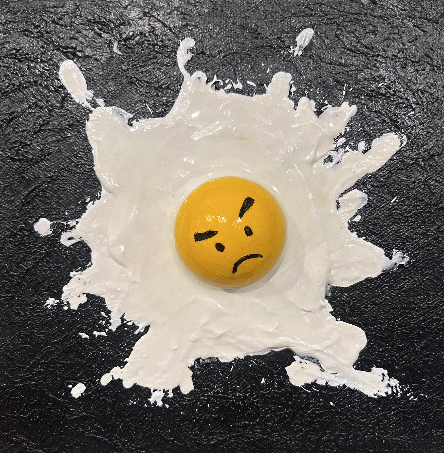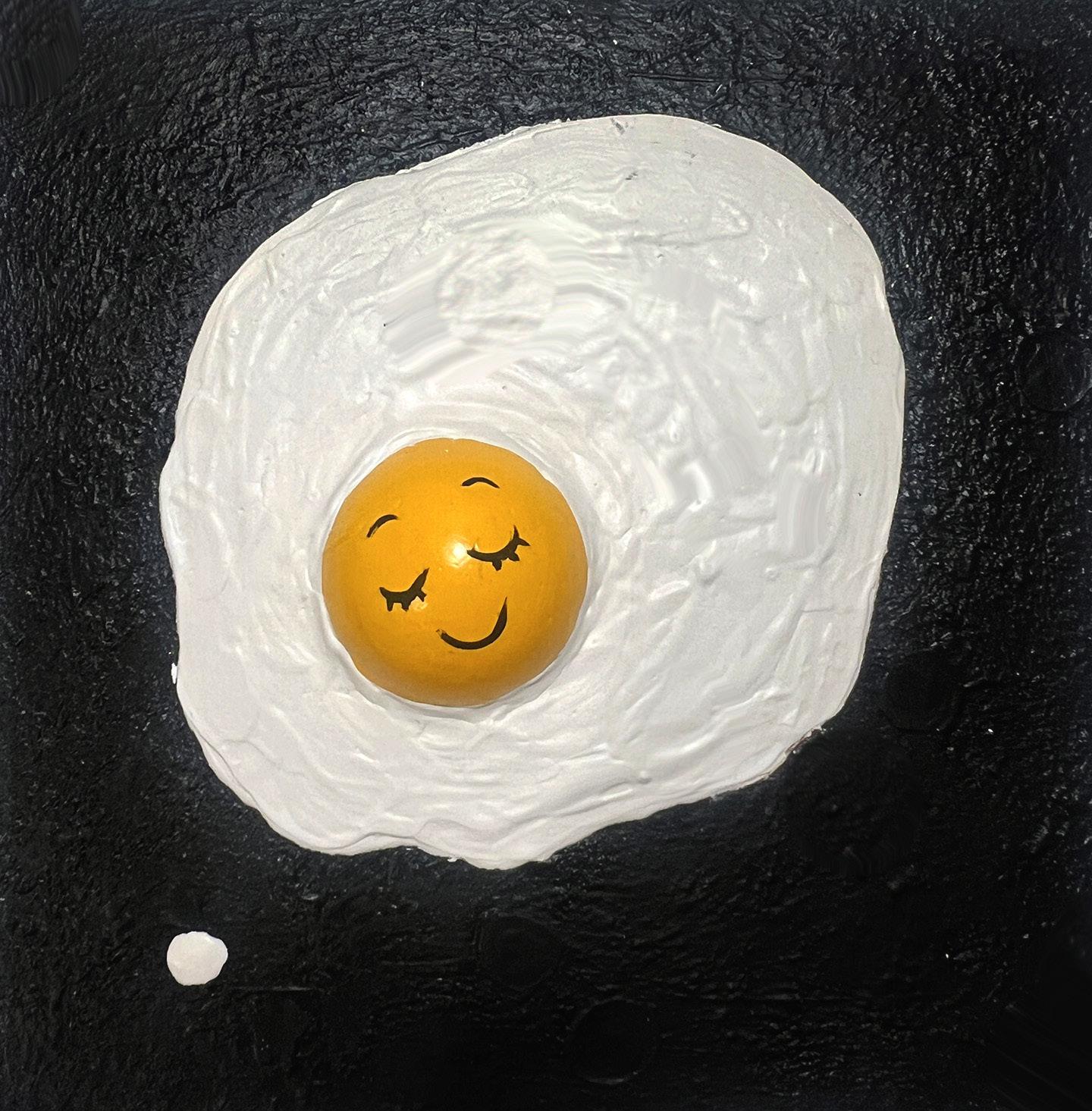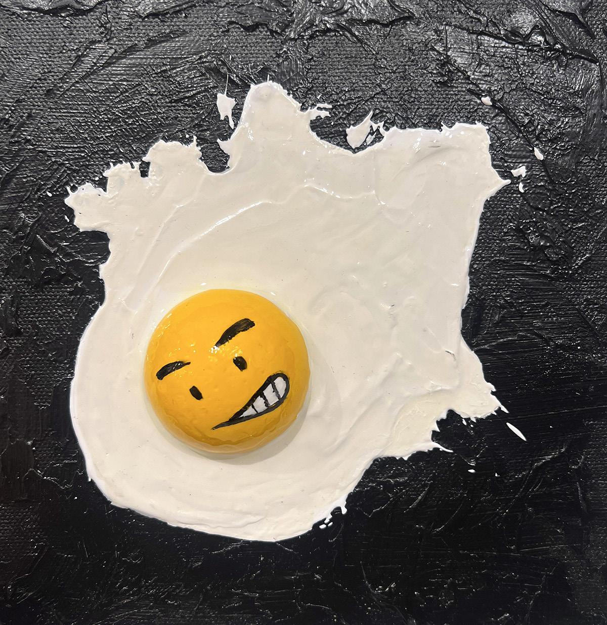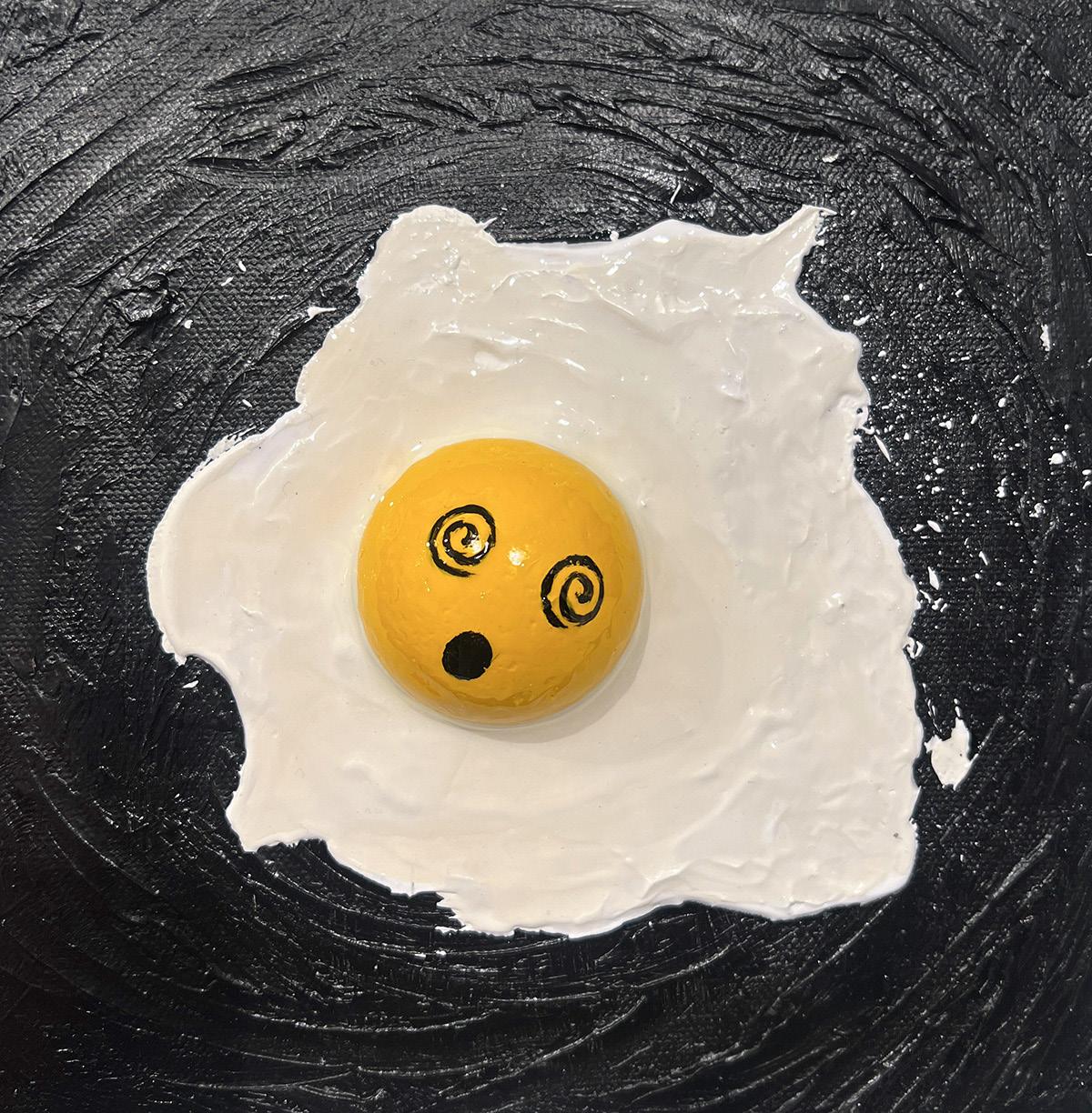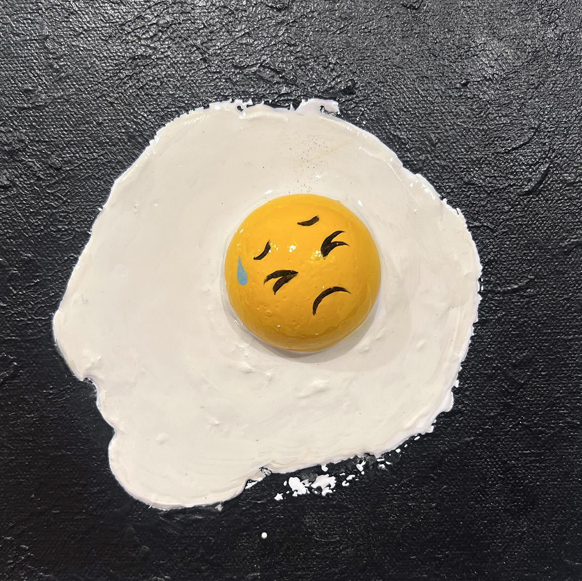 Sarah Shinhyo Kim is a Korean-American artist using pop imagery to navigate existential and societal questions. At Affordable Art Fair, Shinhyo presents paintings from her Eggspression series. The work, made of acrylic and resin, depicts fried eggs humanized with emojis. During a routine breakfast preparation, Kim noticed how the yolk remained still, while the egg whites continuously changed form, which prompted a reflection on the complexity and mutability of human emotions. Just like people are influenced by outer circumstances, Kim’s eggs fluctuate in shape and texture, subject to varying degrees of heat, oil, and environmental conditions. Ubiquitous and seemingly prosaic, eggs are turned into symbols of nourishment, symbolizing the essence of every living being. Paired with emojis, they illustrate the profound interconnectedness of human beings, highlighting the intricate dance of relationships and the shared experiences that mold our individual and collective identities.