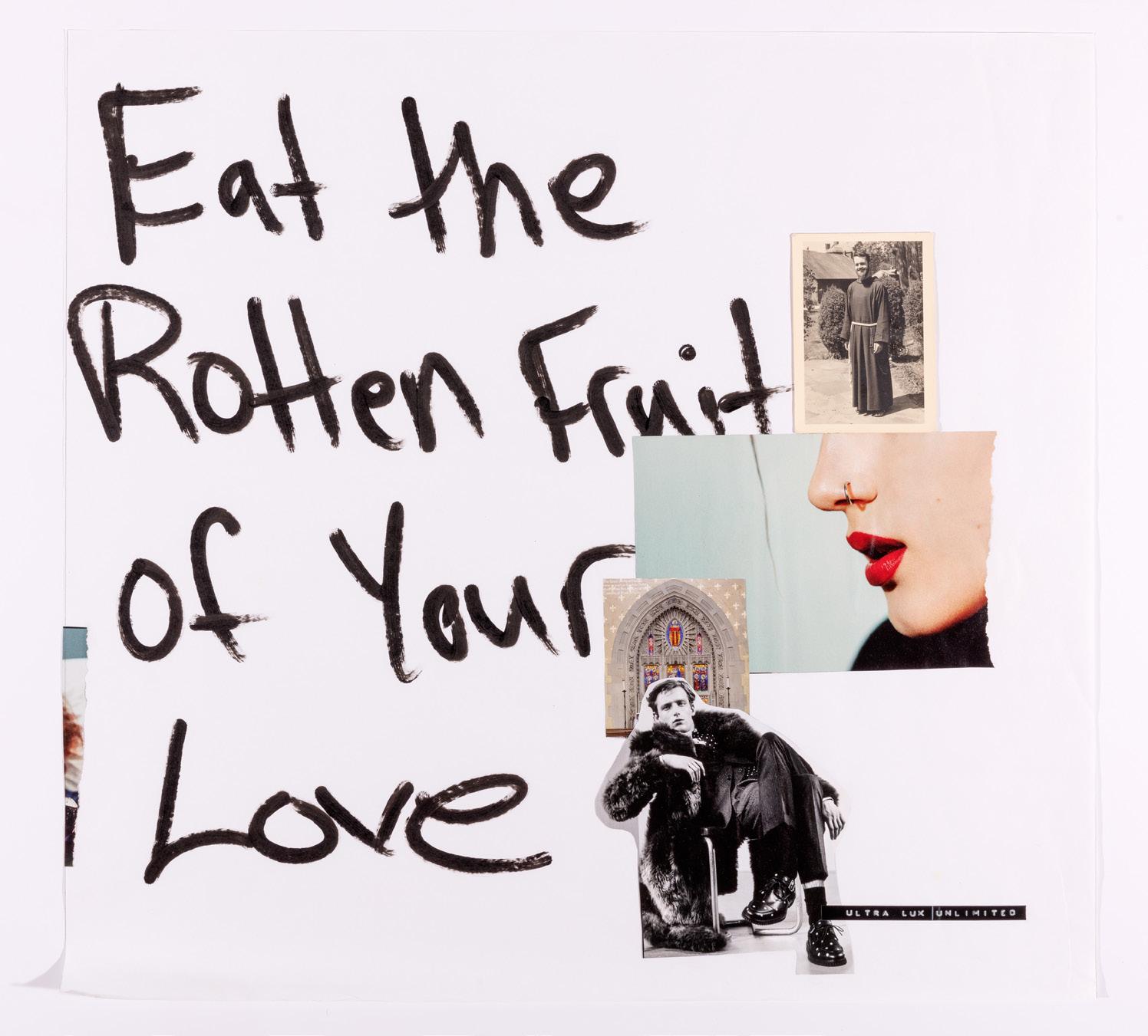 Atkinson’s multi-media works combine imagery from his day-to-day life with imagery from pop culture and street art, which are assembled into collaged pieces. Atkinson applies dynamic brush strokes and lines in a gestural mode to contrast the graphic imagery and leaves his makings exposed and unedited. The lack of shading, and inclusion of negative space allows for a focus on both form and symbolism. The diverse range of materials, source imagery, and the artist’s re-contextualization of figures and text prompt all viewers to consider new paths and perspectives of critical thought.
