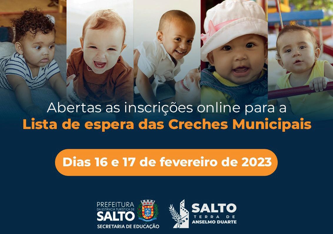 A Prefeitura de Salto, por intermédio da Secretaria Municipal da Educação, informa que as inscrições online para a lista de espera das Creches (Educação Infantil I) estarão abertas nos dias 16 e 17 de fevereiro de 2023.