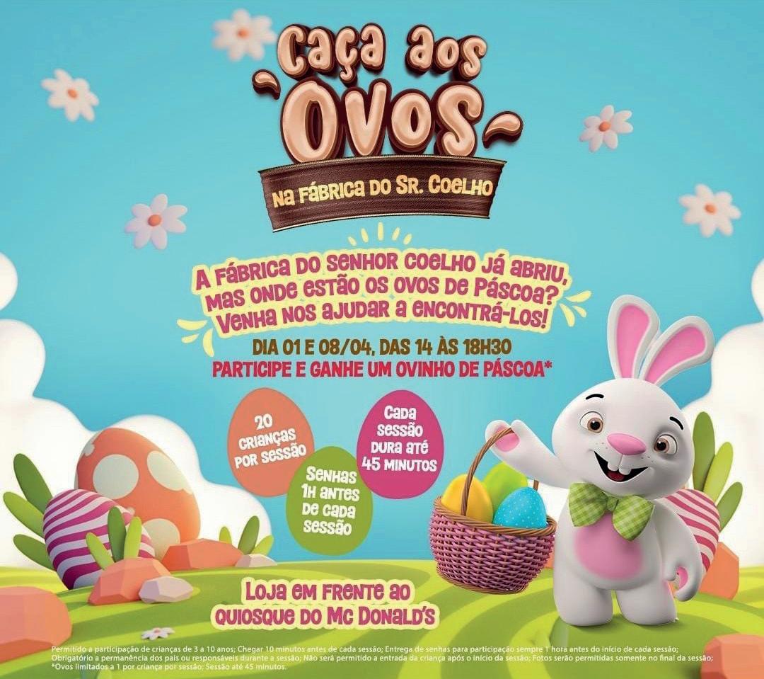 A Caça aos Ovos, que já é um evento tradicional no empreendimento, será realizada nos dias 1º e 8 de abril, das 14h às 18h30. Todos que desejarem ajudar o Sr. Coelho a encontrar as delícias de chocolate deverão pegar uma senha uma hora antes de cada sessão.