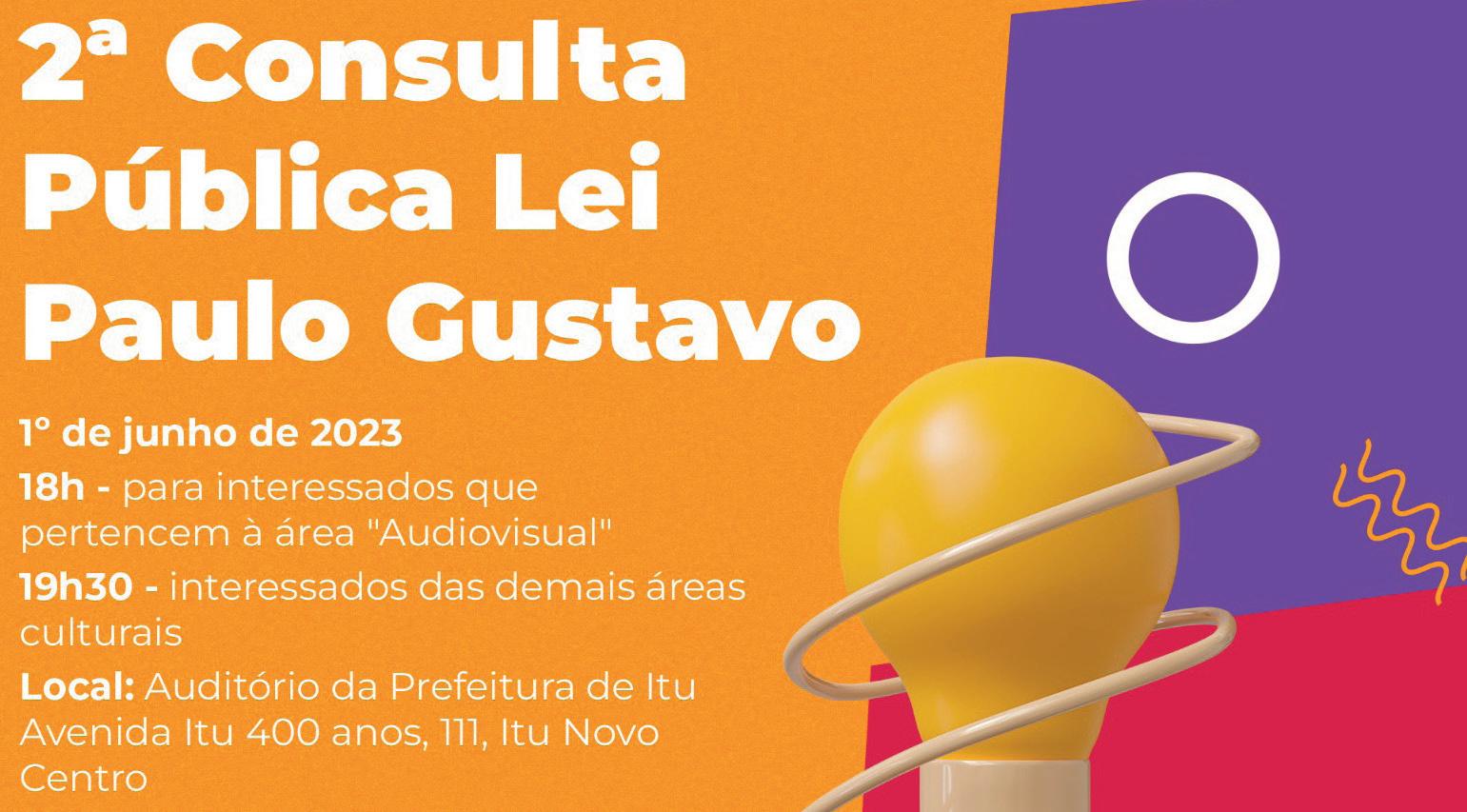 A Prefeitura da Estância Turística de Itu, através da Secretaria de Cultura e Patrimônio Histórico, convoca os "Fazedores de Cultura" - representantes de todas as áreas e segmentos artísticos e culturais residentes no município para a 2ª Consulta Pública com os potenciais interessados em receber recursos da Lei Paulo Gustavo.