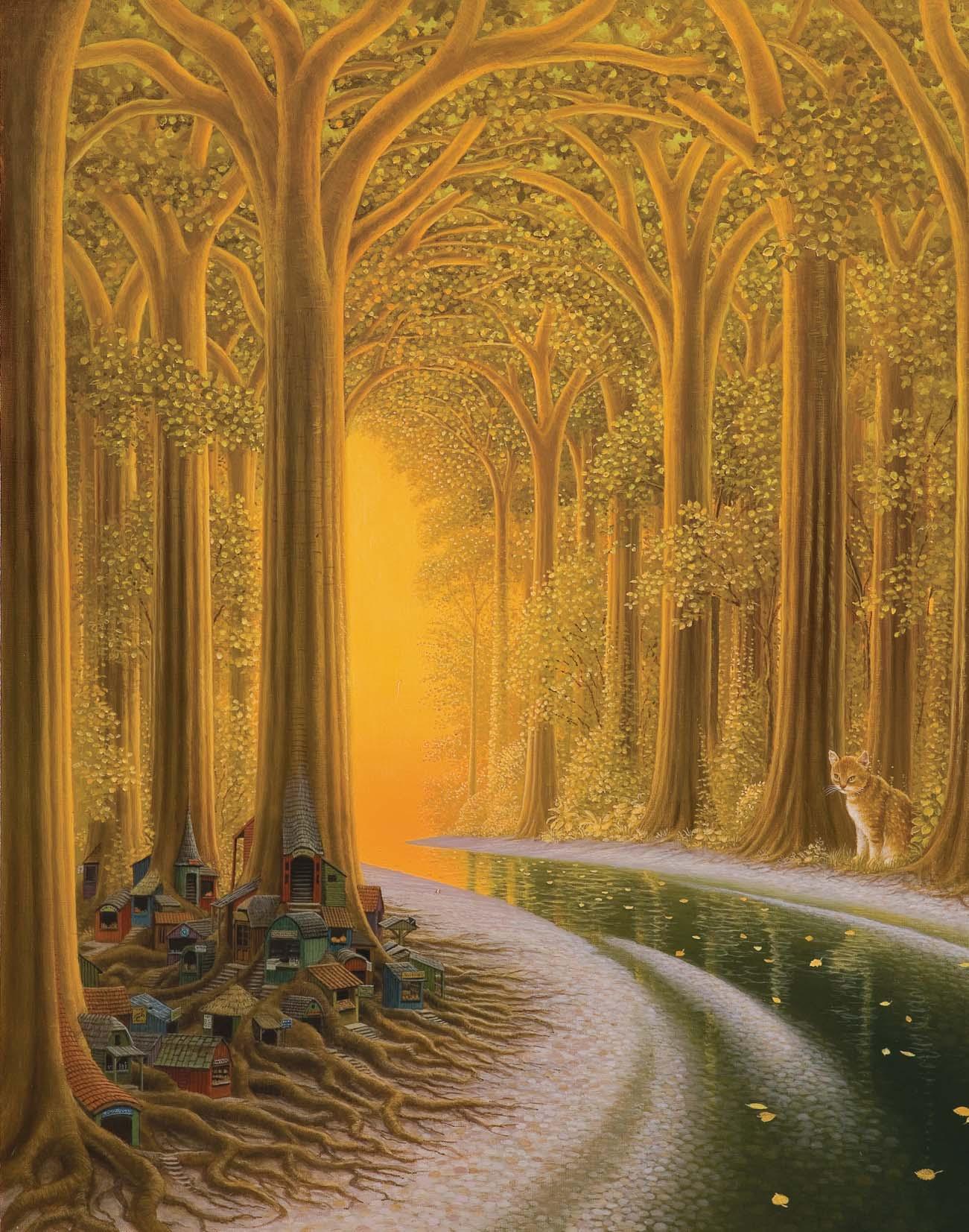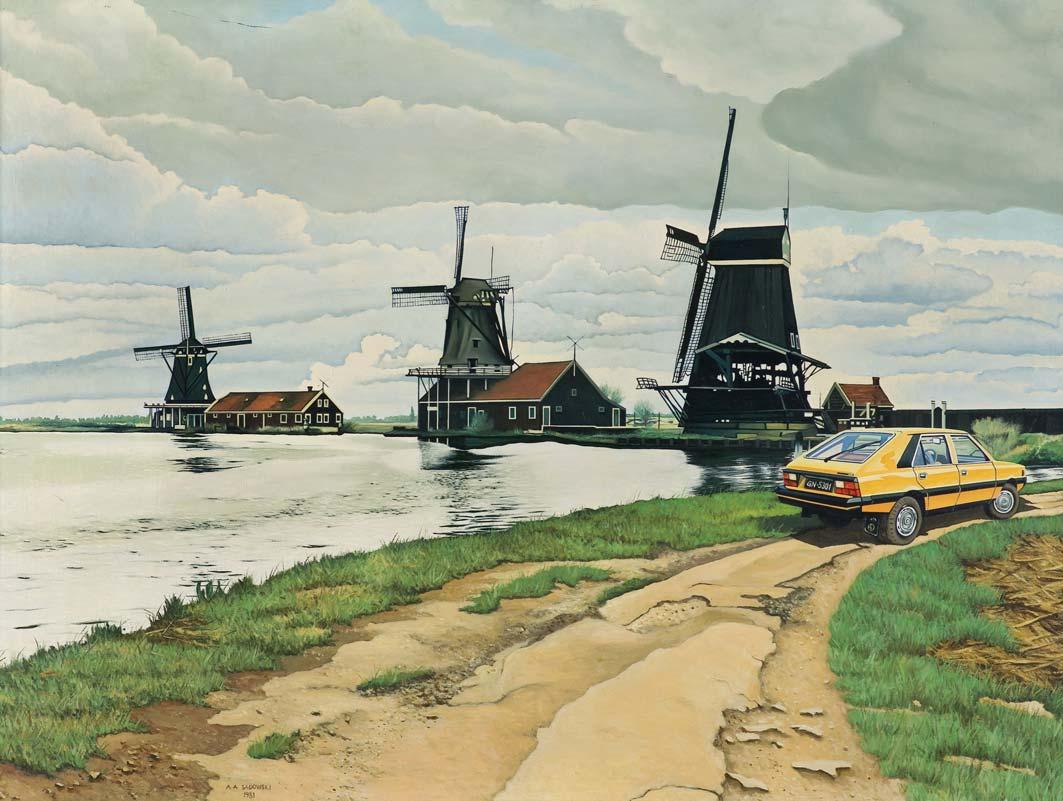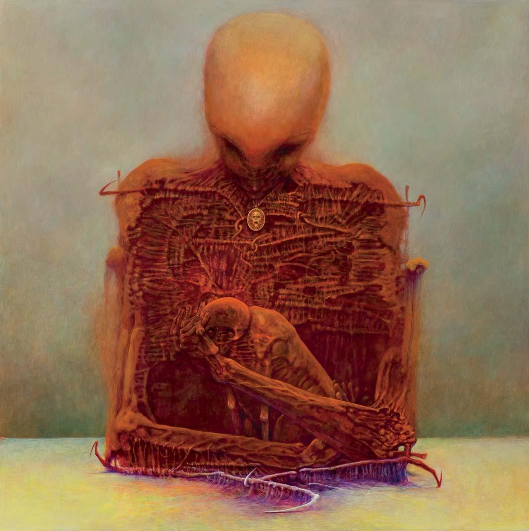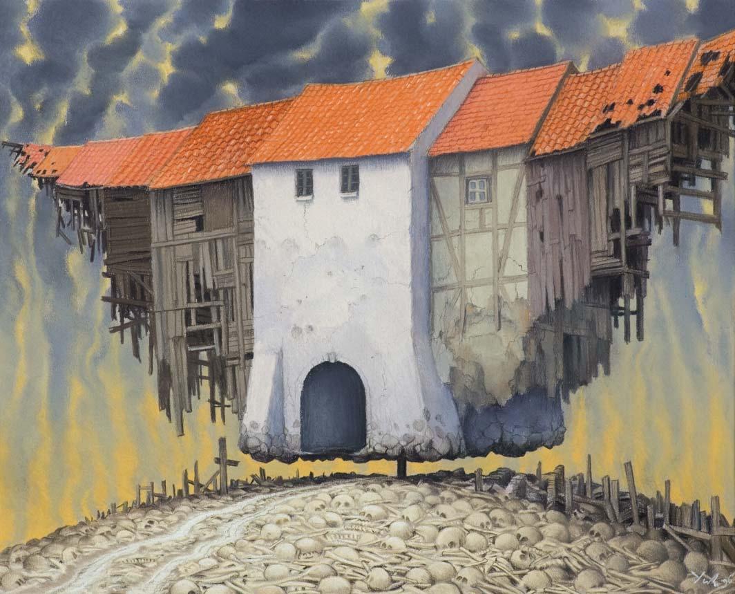 Temat ten artysta zrealizował również w wersji akrylowej pt. Wielki odlot, różniącej się szczegółami. W albumie, wydanym przez Agra-Art, artysta tak komentował ten obraz: To już chyba koniec. Słońce zamienia się powoli w supernową i obejmuje bąblem swojej chromosfery kolejne planety. Życie na Ziemi przestaje istnieć (...). Na ostatniej ocalałej drodze ostatniego miasta, budynki zbierają się do odlotu. Może zdążą ociężale odfrunąć, zanim słoneczna atmosfera spopieli drewno i skruszy ceglane dachówki. Następny przystanek Mars.
