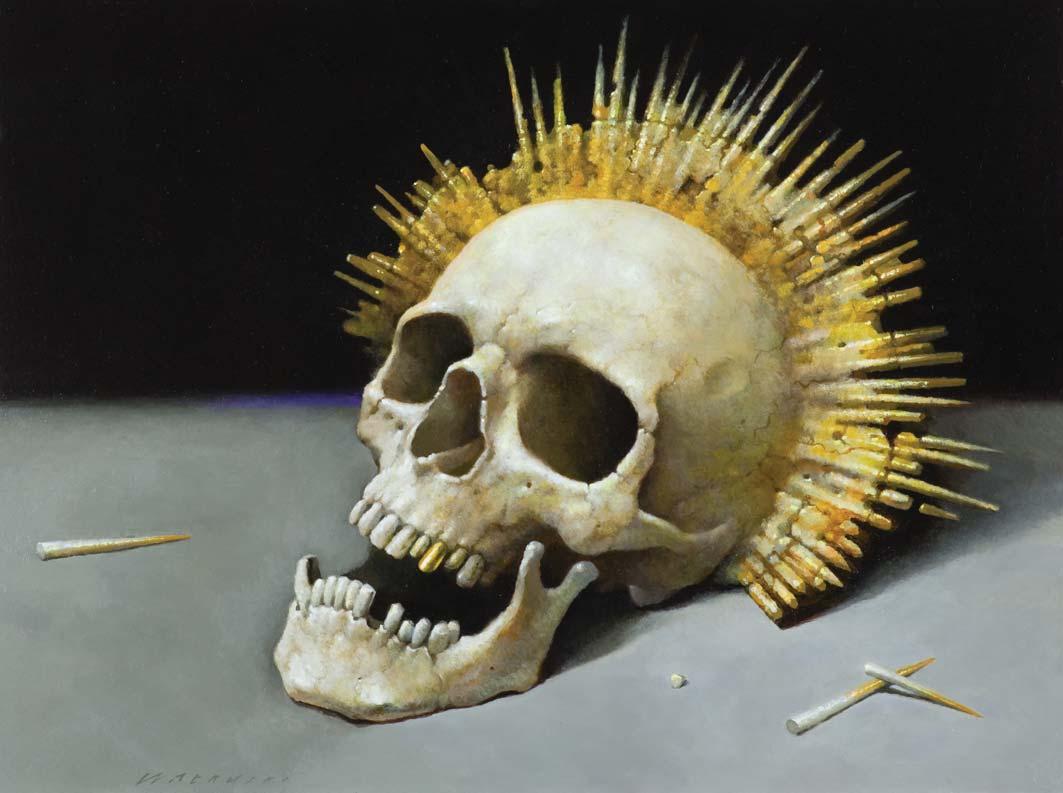 olej, płyta, 60 x 80 cm sygn. l.d.: WAŁKUSKI sygn. na odwr. na płycie l.g.: WIESŁAW WAŁKUSKI W [w kółku] | OIL, 2021, Warszawa | „CZASZKA ŚWIĘTEGO“ (AUREOLA) | z cyklu „Martwe natury“