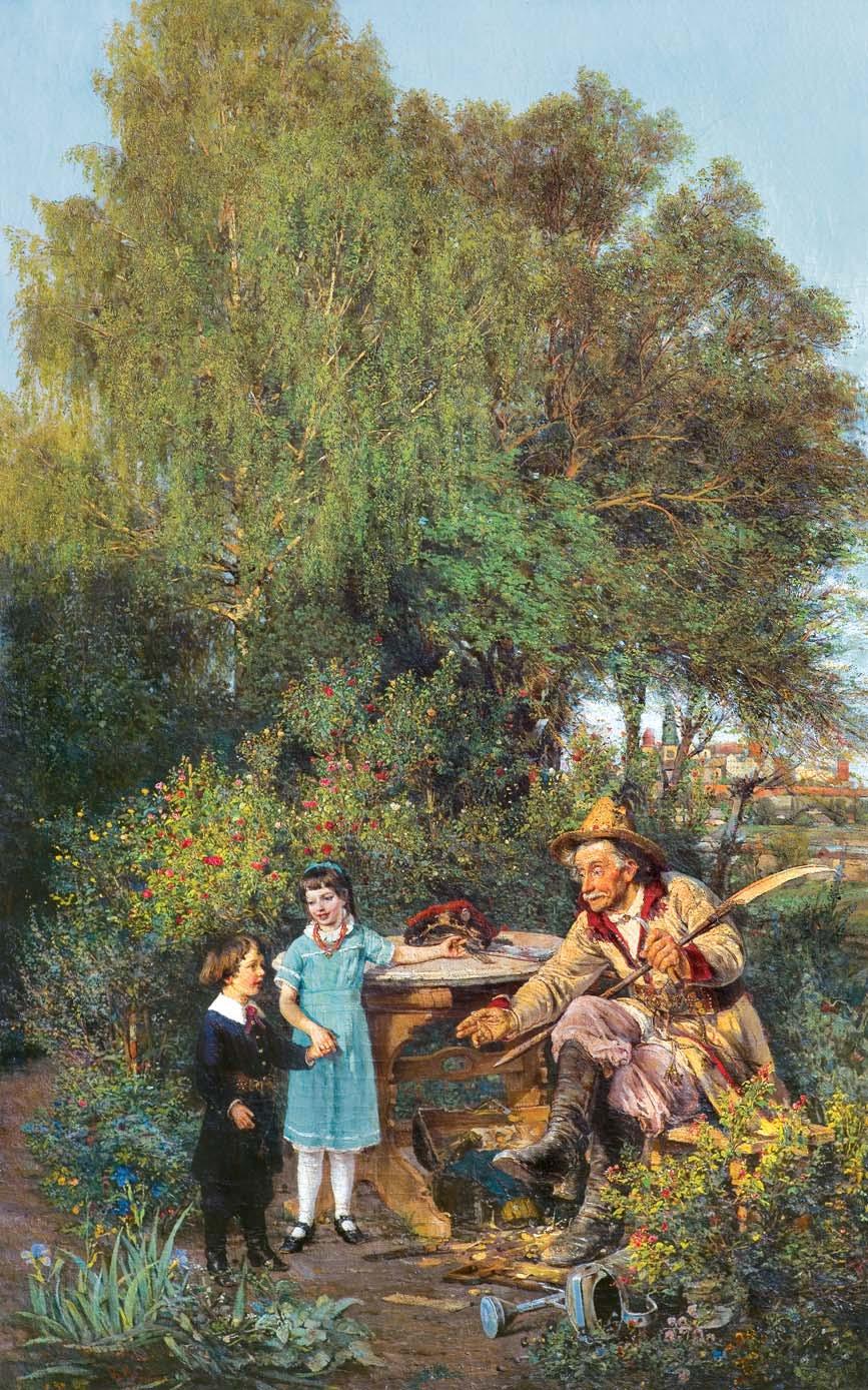 Na kamiennej ławie siedzi brodaty mężczyzna w historycznym stroju. Na podstawie archiwalnych zdjęć oraz kroniki filmowej z 1938 możemy przypuszczać, że ów mężczyzna był u Fukiera atrakcją i swego rodzaju reklamą Pozwala nam to również datować obraz na ok. 1939 rok.