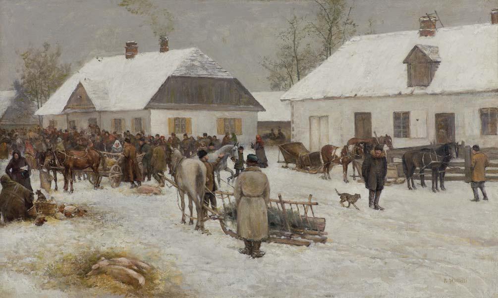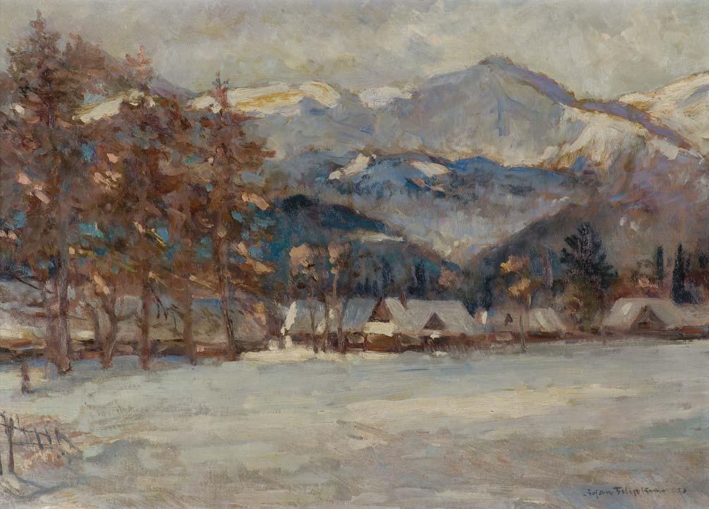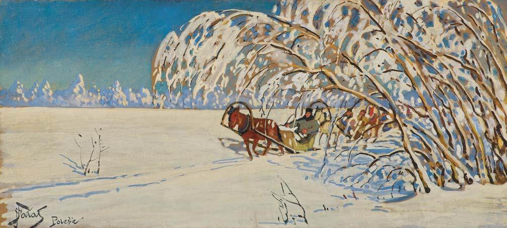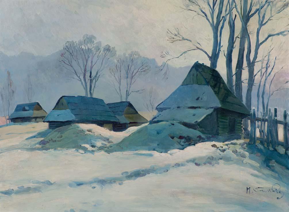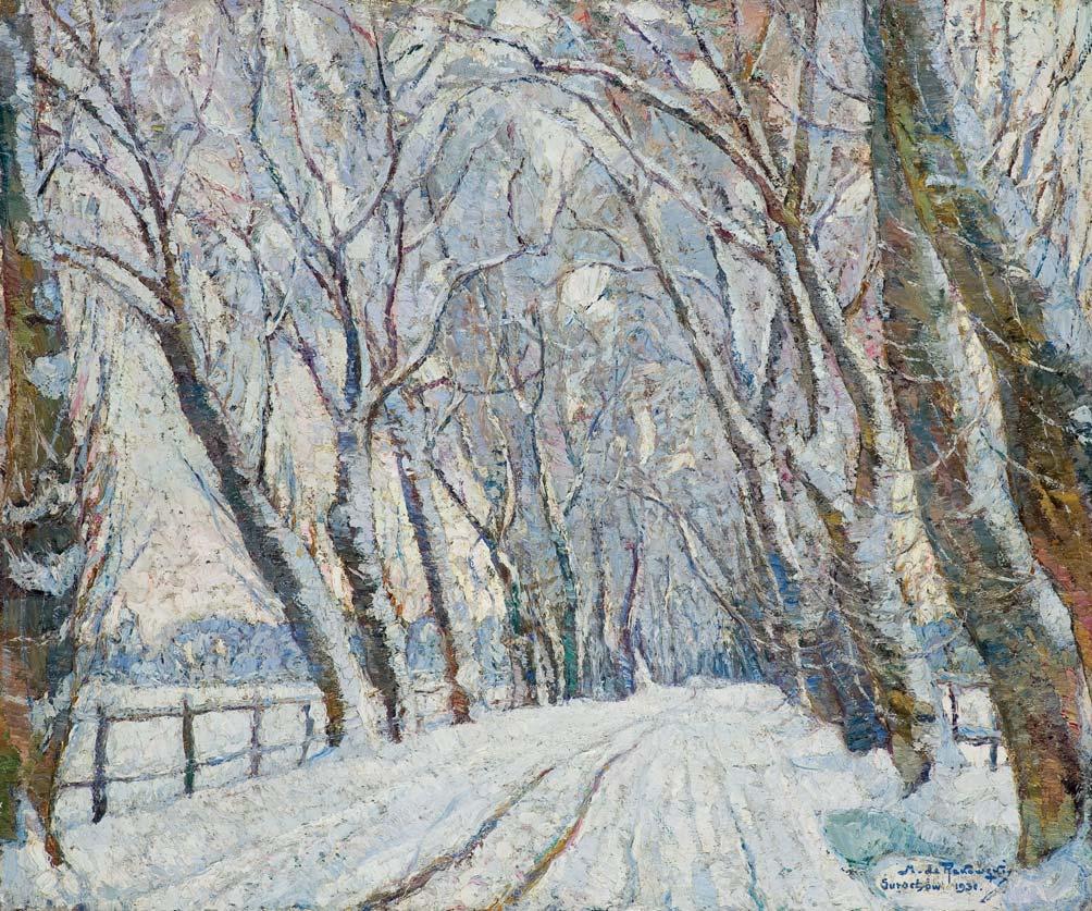 PEJZAŻ ZIMOWY Z SUROCHOWA, 1931 olej, płótno, 54,2 x 64,8 cm sygn. p.d.: M. de Rakowski | Surochów 1931.