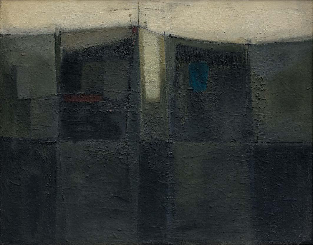 akryl, płótno, 65 x 73 cm; sygn. p.d.: JERKA 90 sygn. na odwrocie na dolnej listwie krosna: JACEK JERKA | „OSTATNI TRAMWAJ“ | AKRYL 1990 l.g. pieczątka zezwalająca na wywóz za granicę