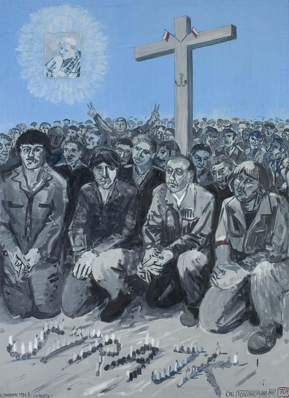 Tłum na obrazie Strajk jest milczący, rozmodlony, niektórzy robotnicy w pierwszym szeregu patrzą na dokumentalistę, ale nie przerywają swej czynności. Niektórzy sprawiają wrażenie, że pozują biorąc udział w scenie specjalnie zaaranżowanej dla widza, ktoś z głębi unosi ręce do góry w geście zwycięstwa. Jest też wyraźnie ukazana inspiracja – unoszący się w kolistym obłoku portret papieża Jana Pawła II i prosty krzyż z małymi biało-czerwonymi chorągiewkami i emblematem Polski walczącej. Bo ci robotnicy walczą o lepszy byt i lepszą Polskę.