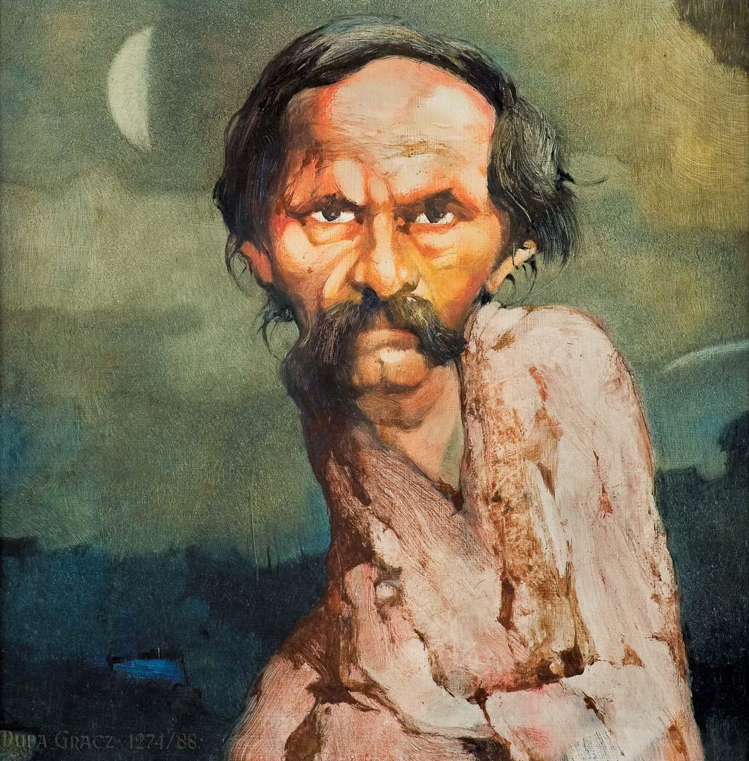Z reguły konterfekty znajomych z pokrewnej branży nie powstawały na zamówienie, ale były naturalną dla malarza formą wyrażenia wdzięczności i uznania. Nieco inny charakter miała geneza wizerunku Bohdana Smolenia, która była owocem artystycznej współpracy, jaka zaistniała przy okazji wznowienia działalności niezwykle popularnego w 2. połowie lat 70. poznańskiego kabaretu „Tey“(1988-1990). Powrót obsady na scenę w „dawnym“ składzie – Zenon Laskowik, Bohdan Smoleń, Krzysztof Jaślar, Rudi Schubert, Janusz Rewiński, Aleksander Gołębiowski – miał być przypomnieniem uwielbianych przez publiczność skeczy w zaktualizowanym wydaniu. Uznano, że najlepszym tłem dla przebojów grupy będzie monumentalna kopia obrazu Dudy Gracza Jeźdźcy Apokalipsy, czyli fucha z 1977 roku. Na pomysł wykorzystania go w scenografii artysta zareagował entuzjastycznie, ale postawił jeden warunek – w zamian za prawo do jednokrotnego skopiowania swego dzieła, otrzyma możliwość sportretowania „Bodzia“. Wielki podziw dla talentu satyryka nie zdołał uśpić wprawnego oka portrecisty. Efektem było dalekie od metafory i pozbawione jakichkolwiek atrybutów profesji wnikliwe studium aktora – poważnego mężczyzny o wycofanej, zgaszonej postawie i bystrym, przeszywającym spojrzeniu. Tym samym do szerokiej galerii dudagraczowskich postaci dołączył wyjątkowy, intymny portret genialnego kabarecisty, w którym zawarta została prawda o zwykłym, mającym za sobą cały bagaż doświadczeń, człowieku.