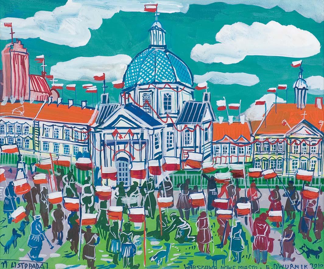 sygn. l.d.: 11 LISTOPADA [w ramce], p.d.: WARSZAWANOWE MIASTO. E. DWURNIK. 2010 na odwr. sygn. i pieczątki, od g.: „Nowy Rynek“ | [pieczątka z nr wpisanym ręcznie:] NA PAPIERZE | NR 12898, [pieczątka:] AKWARELA | E. DWURNIK [ręcznie:] + tempera | [c.d. ręcznie:] spis NR: 2374 [w ramce] | 8-11.XI.2010 | 46 x 55
