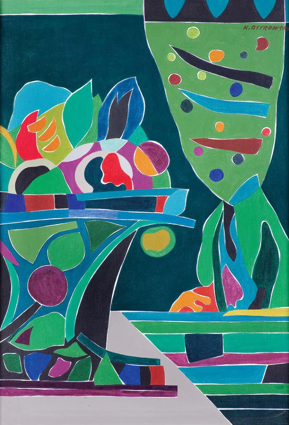 sygn. p.g.: K. OSTROWSKI sygn. flamastrem na górnej listwie krosna: Kazimierz Ostrowski | „Martwa natura na zielonym tle“ acryl –płótno | rozm. 102/72