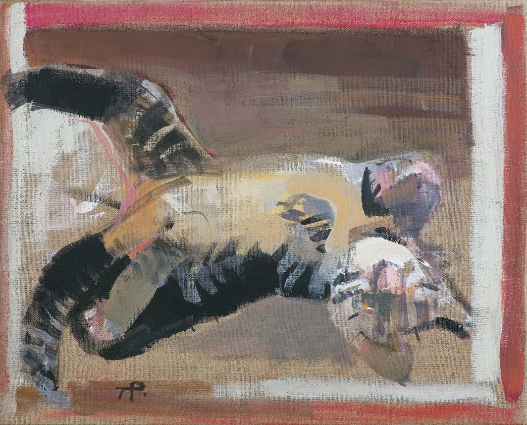 sygn. l.d.: TP na odwrocie na płótnie napis i sygnatura: „KOT WYLEGUJE SIĘ“ | TERESA PĄGOWSKA | 2005