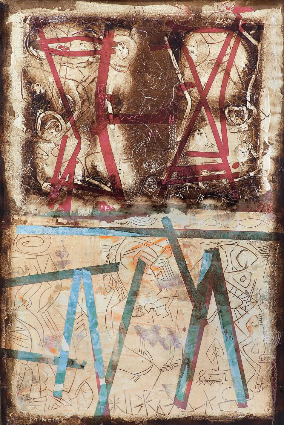 akryl, smoła, płyta, 122 x 81 cm sygn. l.d.: MINCIEL sygn. na odwr. na płycie: AKRYL | EUGENIUSZ | MINCIEL | 2000 po l. znak strzałki w górę, powyżej sygnatury znak strzałek 9
