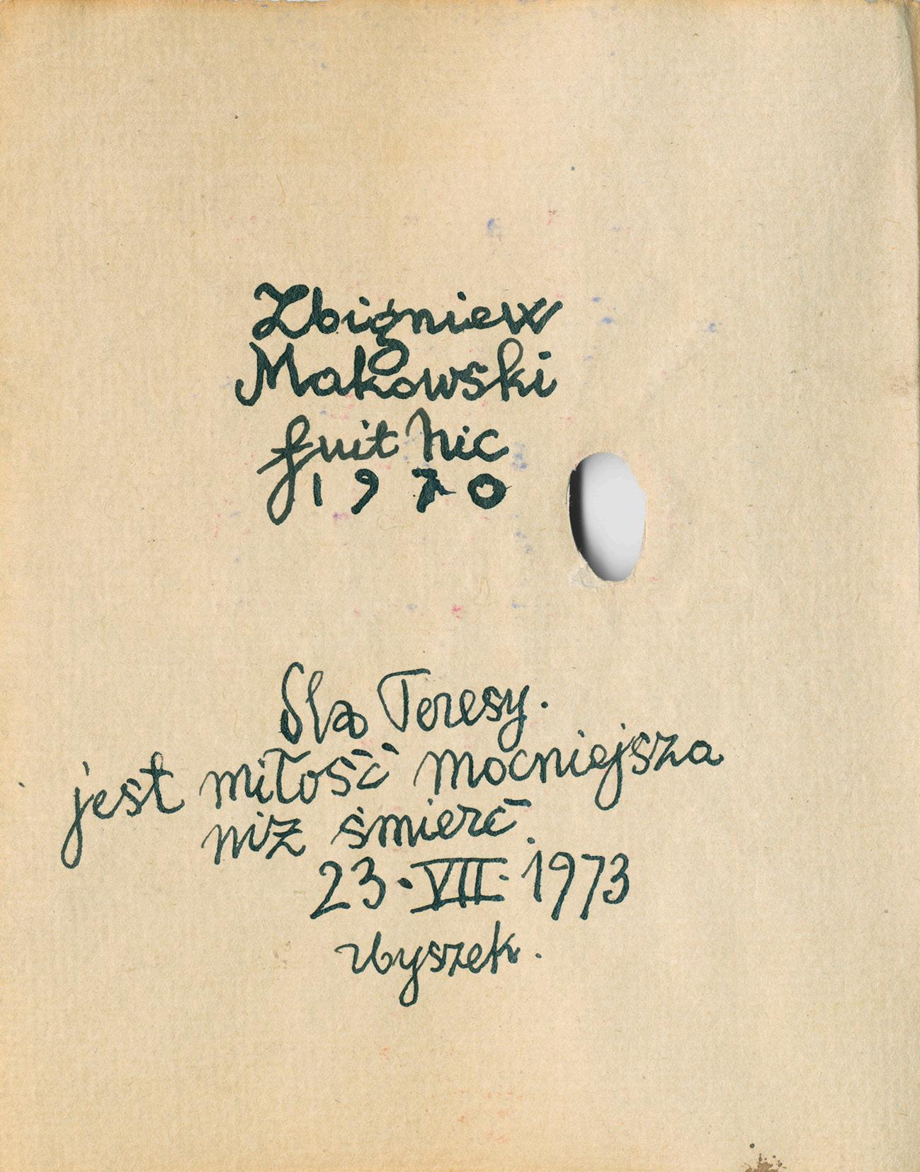 sygn. na II str. okładki: Zbigniew | Makowski | fecit hic | 1970, niżej: dla Teresy | jest miłość mocniejsza | niż śmierć | 23.VI.1973 | Zbyszek