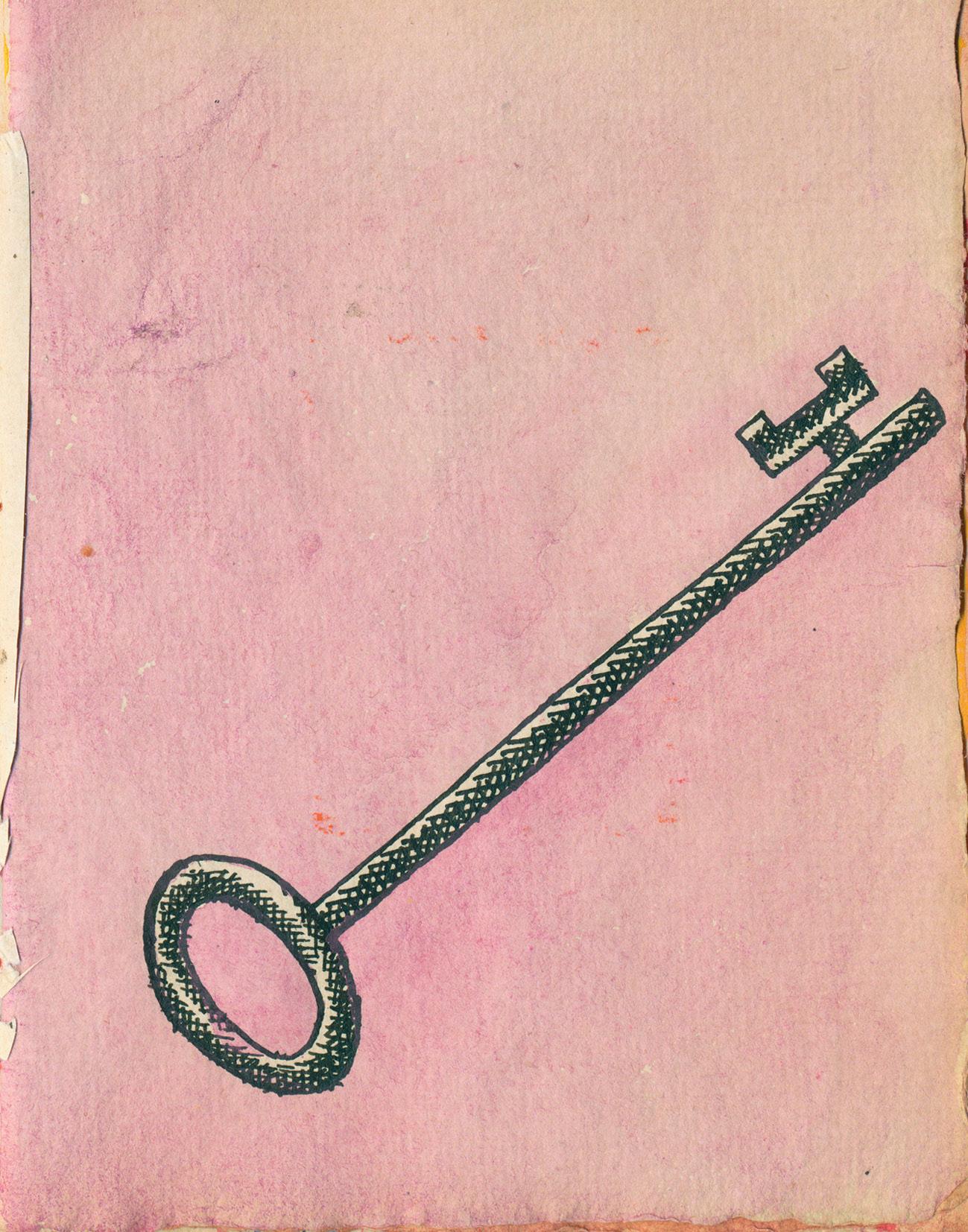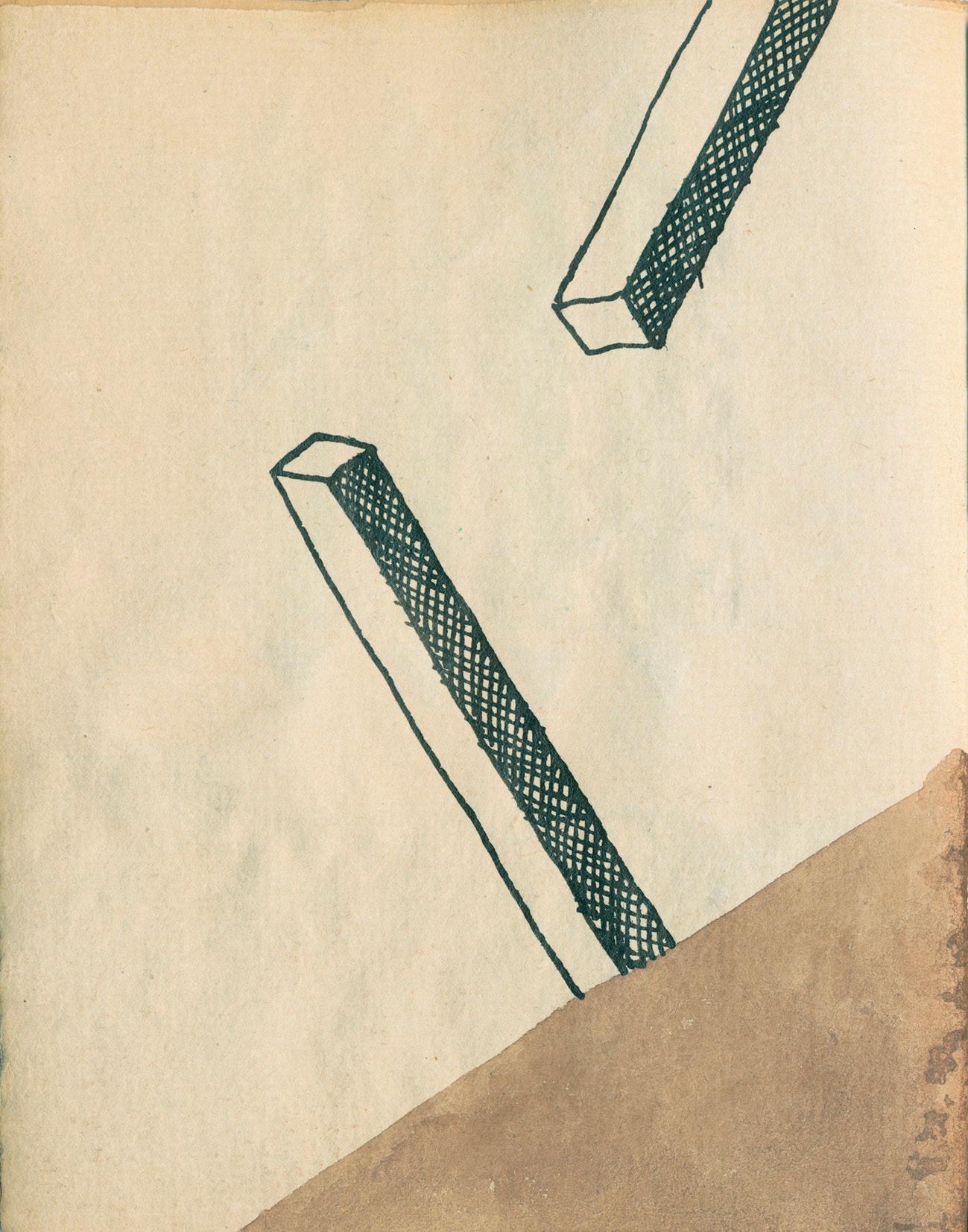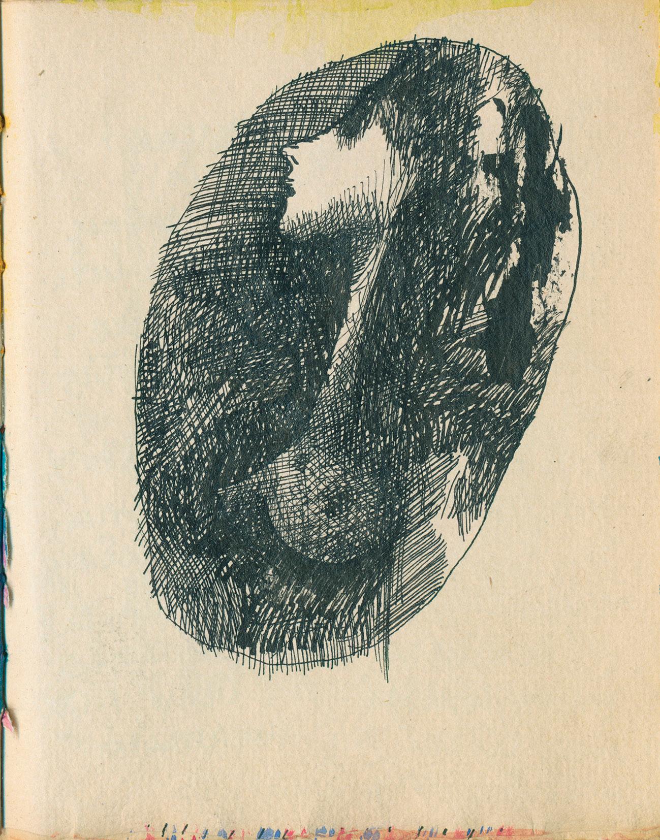 tusz pióro, akwarela, gwasz, papier, bibułka, 12 x 10 cm