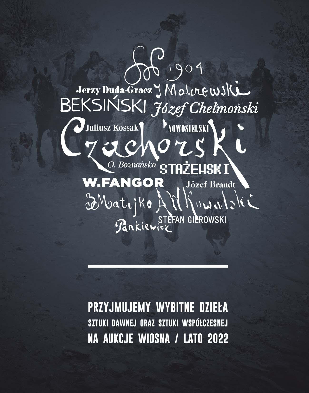 Zgodnie z obowiązującymi wymogami, licytacja odbędzie się w Galerii Agra-Art bez możliwości uczestnictwa na sali aukcyjnej. Zapraszamy do licytacji online, przez telefon lub pozostawienia zlecenia licytacji w Państwa imieniu. Prosimy o zapoznanie się ze zmianą w Regulaminie; § 12. pkt 1.