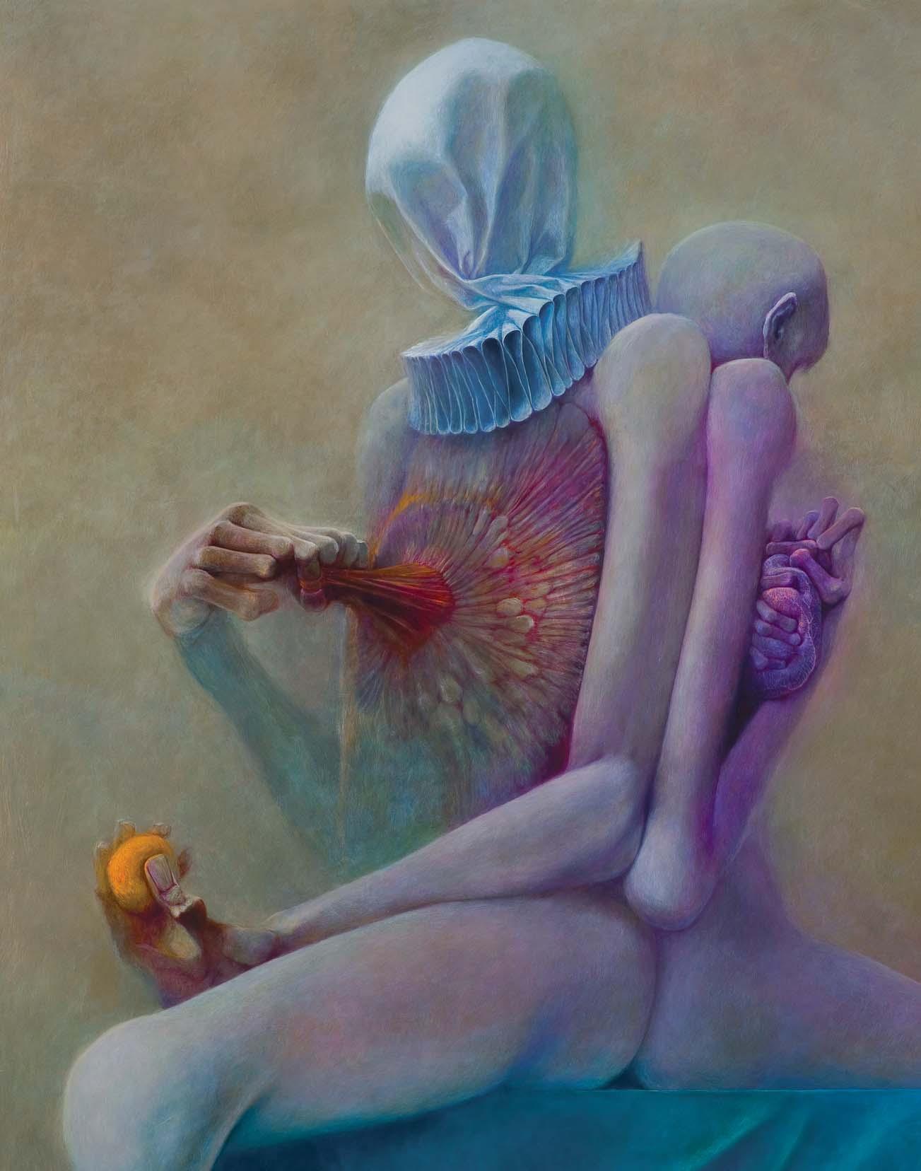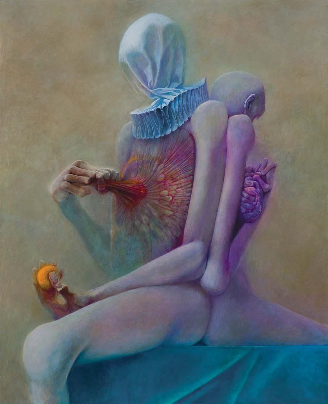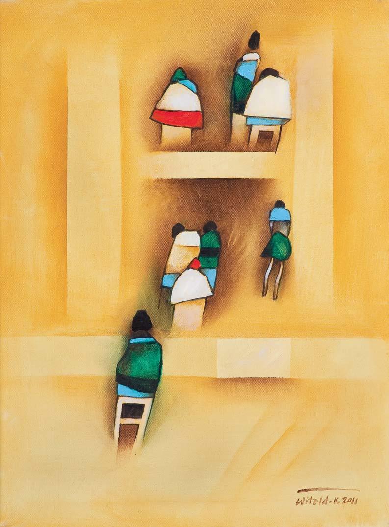 Dla mnie w malarstwie bardziej istotna jest forma niż treść, dlatego też tworząc skupiam się szczególnie na tej piewszej warstwie. Patrząc na obraz widzę abstrakcyjne formy, mimo iż ten w dużej mierze jest obrazem przedstawiającym. Cała sfera znaczeniowa jest dla mnie niewiele mniej tajemnicza niż dla odbiorcy mojego dzieła i uważam, że jest to lepsze od sytuacji gdy obraz od A do Z jest do bólu „wyliczony“. Dla mnie w obrazie musi być miejsce na przypadkowość. To ona daje przyjemność w trakcie pracy. Obraz żyje wtedy własnym życiem, zaskakuje samego twórcę. Nie wykluczam, że mimowolnie tworzę jakiś zapis znaczeniowy w obrazie, ale chyba każdy to robi. Zresztą tworzę przeważnie pod wpływem dużych emocji i jest w obrazie więcej przypadku, niż to widać na pierwszy rzut oka. Czuję się trochę jak ktoś kto utracił pamięć i przy pomocy malowania próbuje odtworzyć obrazy z przeszłości. To niesamowite uczucie.