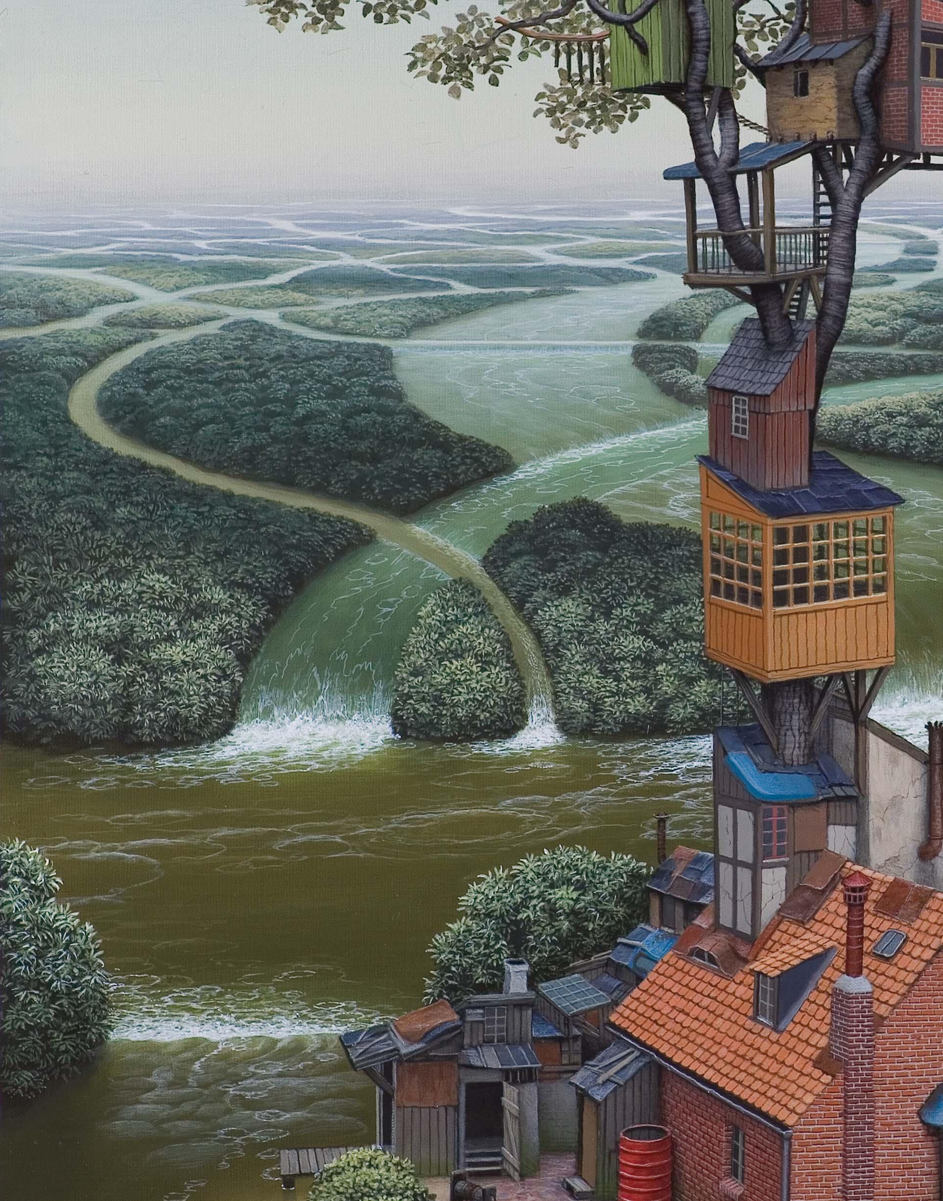 Ten obraz jest pełen szumu wody. Strumyki szemrzą i ciurkają, rzeki przepychają swoje wody na skrzyżowaniach, w huku mniejszych i większych wodospadów. Powodzie są tu zapewne nieliche, domki na drzewie to nie zabawa dla dzieci, ale prawdziwe alternatywne gospodarstwo.