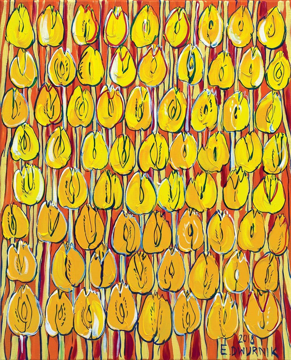 akryl, płótno, 81 x 65 cm sygn. p.d.: 2018 | E. DWURNIK sygn. na odwrocie na płótnie: 2018 | E. DWURNIK | „ŻÓŁTE | TULIPANY“ | NR: XXII [w ramce] – 1579 | – 7500