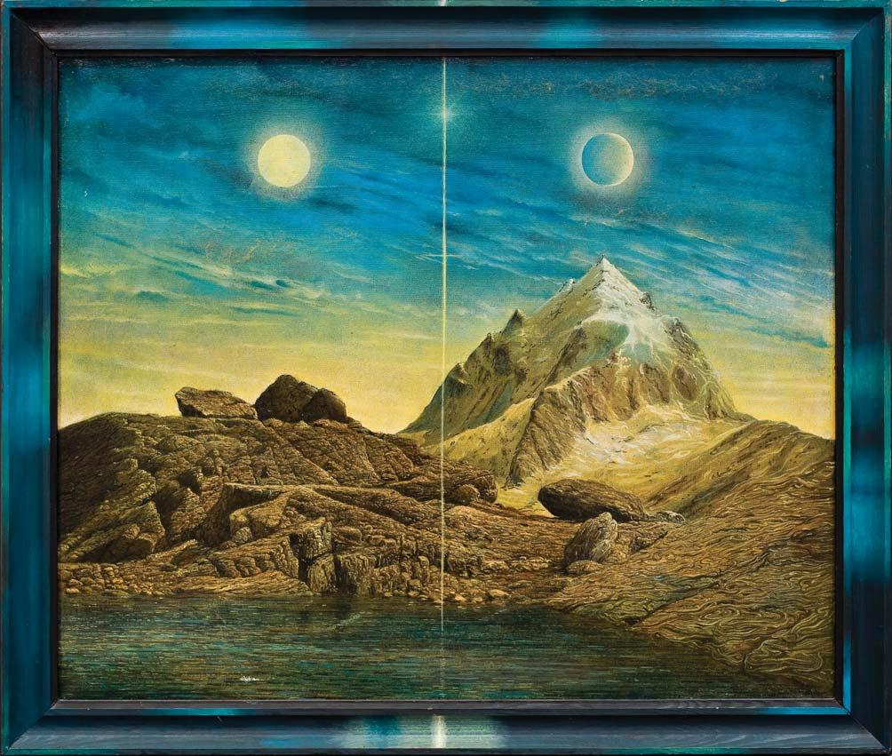 KRAJOBRAZ Z TĘCZĄ III | 1991 na odwr. na płótnie podłużna pieczęć wywozowa z nr. i podpisem; na blejtramie nalepka z adresem autora