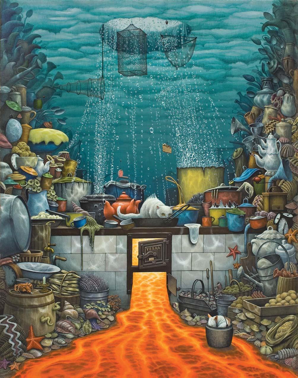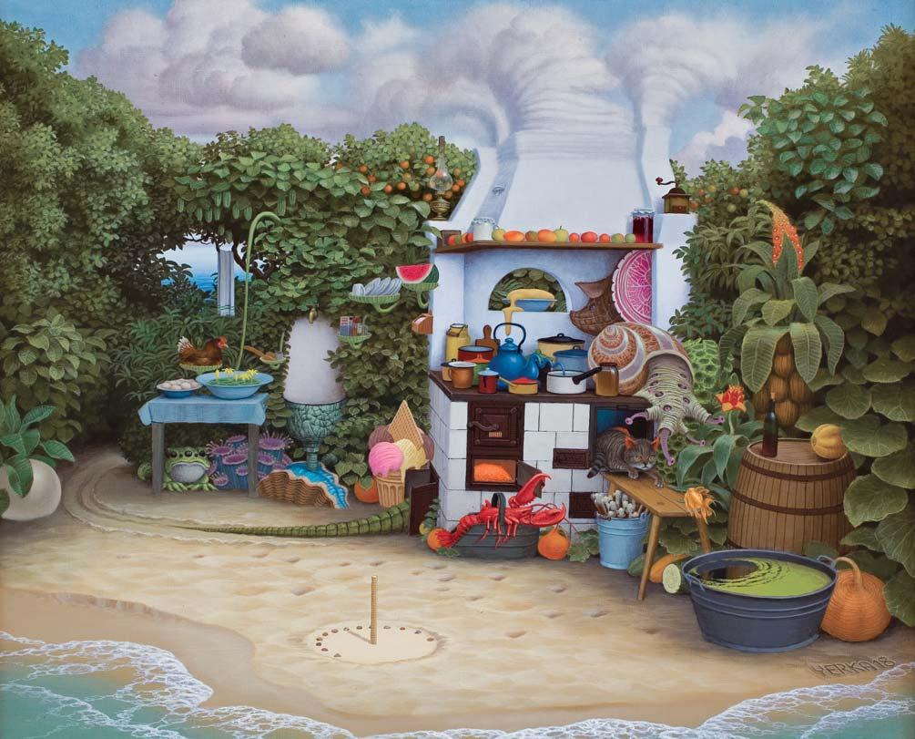 sygn. p.d.: YERKA 18 sygn. na odwrocie na dolnym krośnie p.d.: JACEK YERKA | LETNIA KUCHNIA – Z CYKLU KIESZONKOWA | AKRYL 2018 DŻUNGLA
